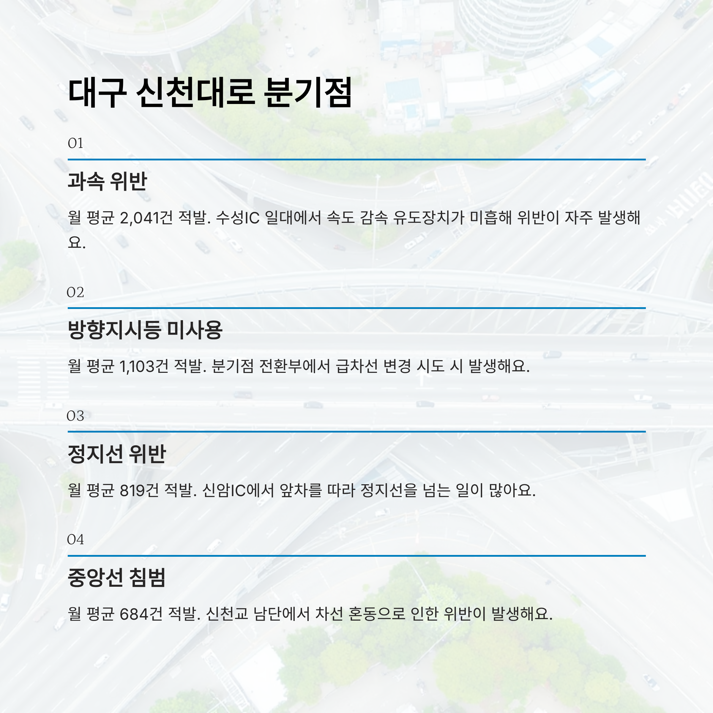 대구 신천대로는 시내 중심과 외곽을 빠르게 연결하는 고속화도로로, 특히 분기점 구간은 수많은 차량들이 진입과 진출을 반복하면서 교통법규 위반이 자주 발생하는 곳이에요. 분기점에서는 빠른 판단과 차선 이동이 필요한데, 이 과정에서 실수가 많아져요.