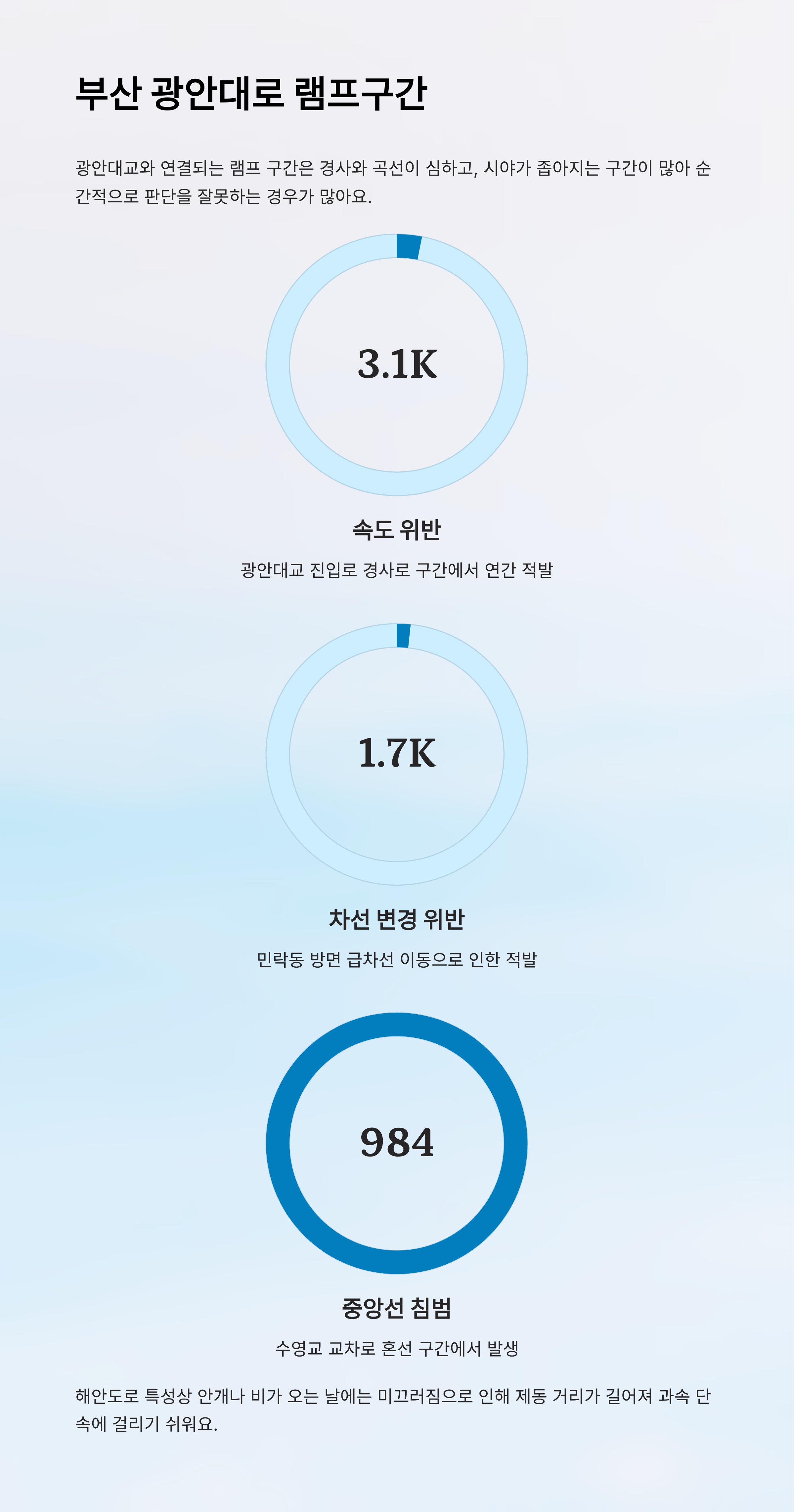 | 속도 위반 | 3,115건 | 광안대교 진입로 | 경사로 구간 |
