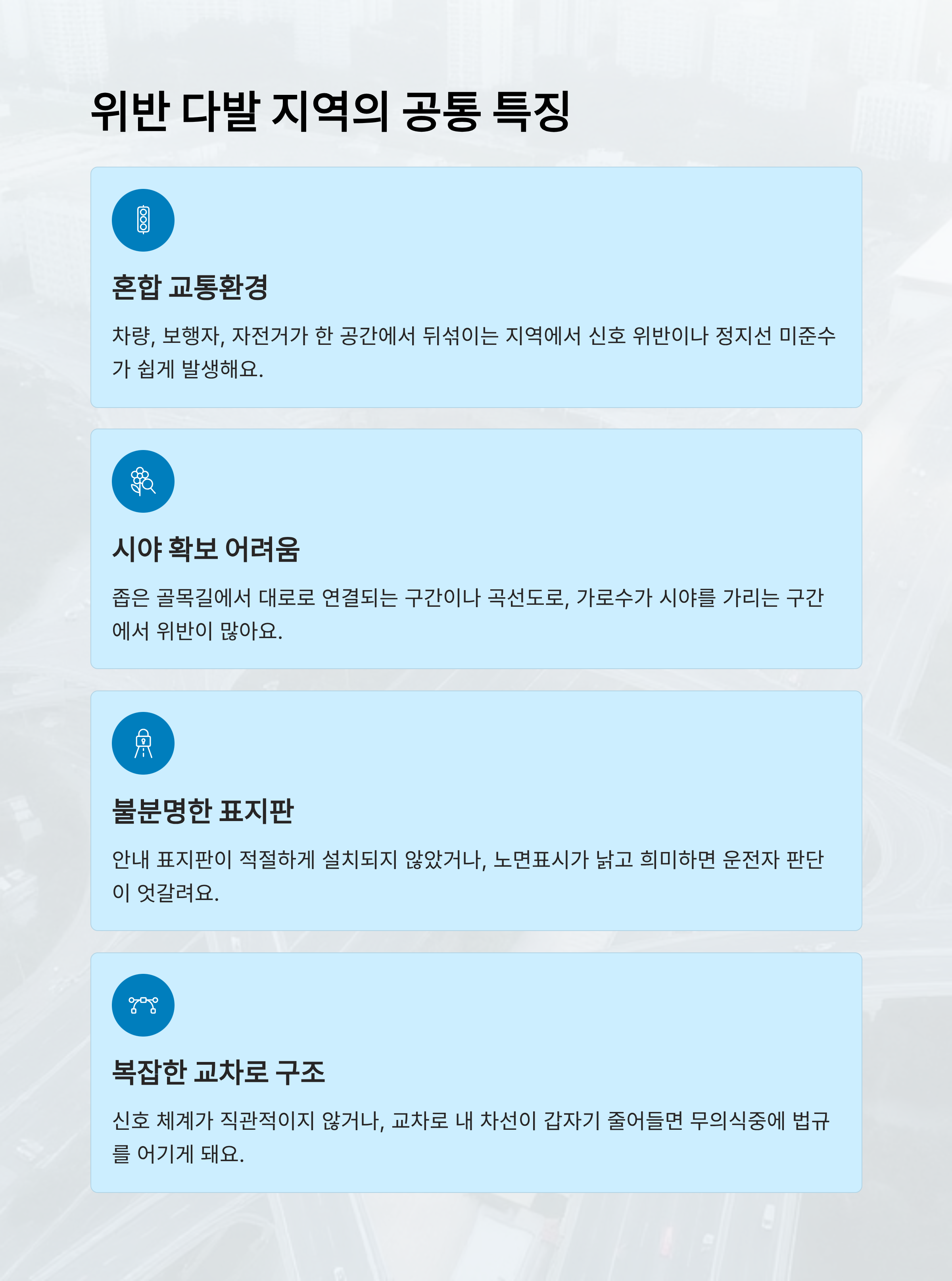 세 번째는 교통표지판이나 노면표시가 불분명하다는 점이에요. 안내 표지판이 적절하게 설치되지 않았거나, 도로에 그려진 화살표·차선이 낡고 희미하면 운전자 판단이 엇갈리게 되고, 결국 위반 상황이 발생할 수 있어요. 특히 외지 운전자에게는 혼란의 연속이죠.