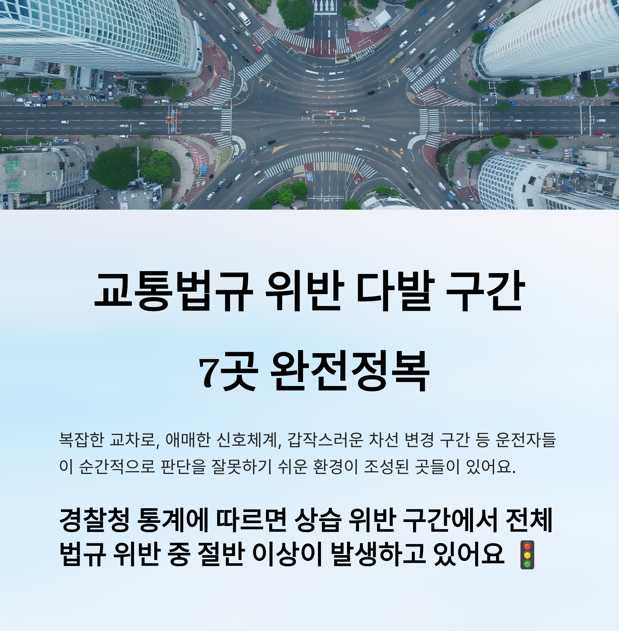 🚘 교통법규를 자주 위반하게 되는 도로에는 그만한 이유가 있어요. 복잡한 교차로, 애매한 신호체계, 갑작스러운 차선 변경 구간 등 운전자들이 순간적으로 판단을 잘못하기 쉬운 환경이 조성되어 있죠. 오늘은 2025년 기준으로 교통법규 위반이 자주 발생하는 대한민국의 대표적인 7곳을 완전히 정복해볼게요!