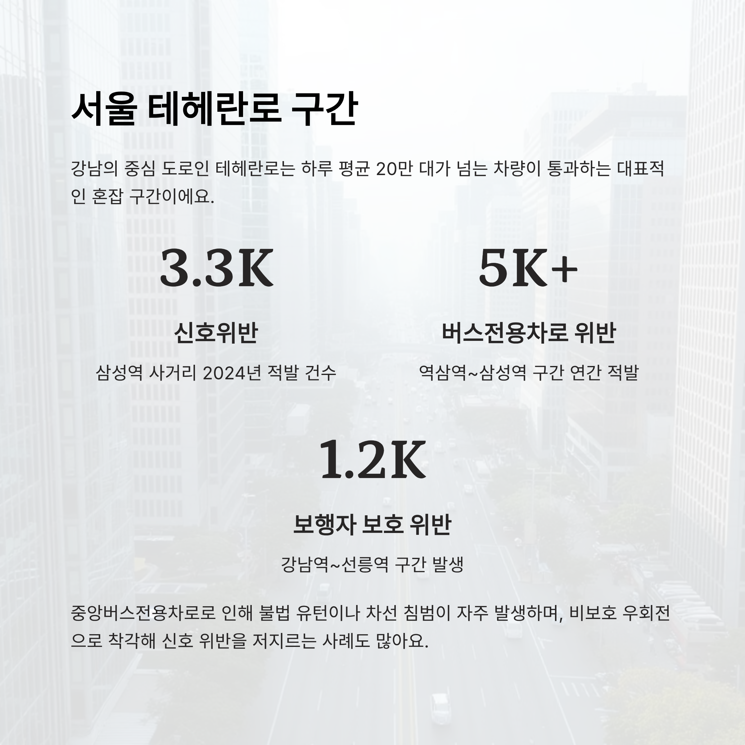 서울 강남의 중심 도로인 테헤란로는 교통량이 하루 평균 20만 대를 넘는 대표적인 혼잡 구간이에요. 이곳은 차량 흐름이 매우 빠르게 진행되면서도 교차로와 횡단보도, 버스전용차로 등이 복잡하게 얽혀 있어요. 덕분에 법규 위반률이 서울 시내에서 손꼽히는 수준으로 높답니다.