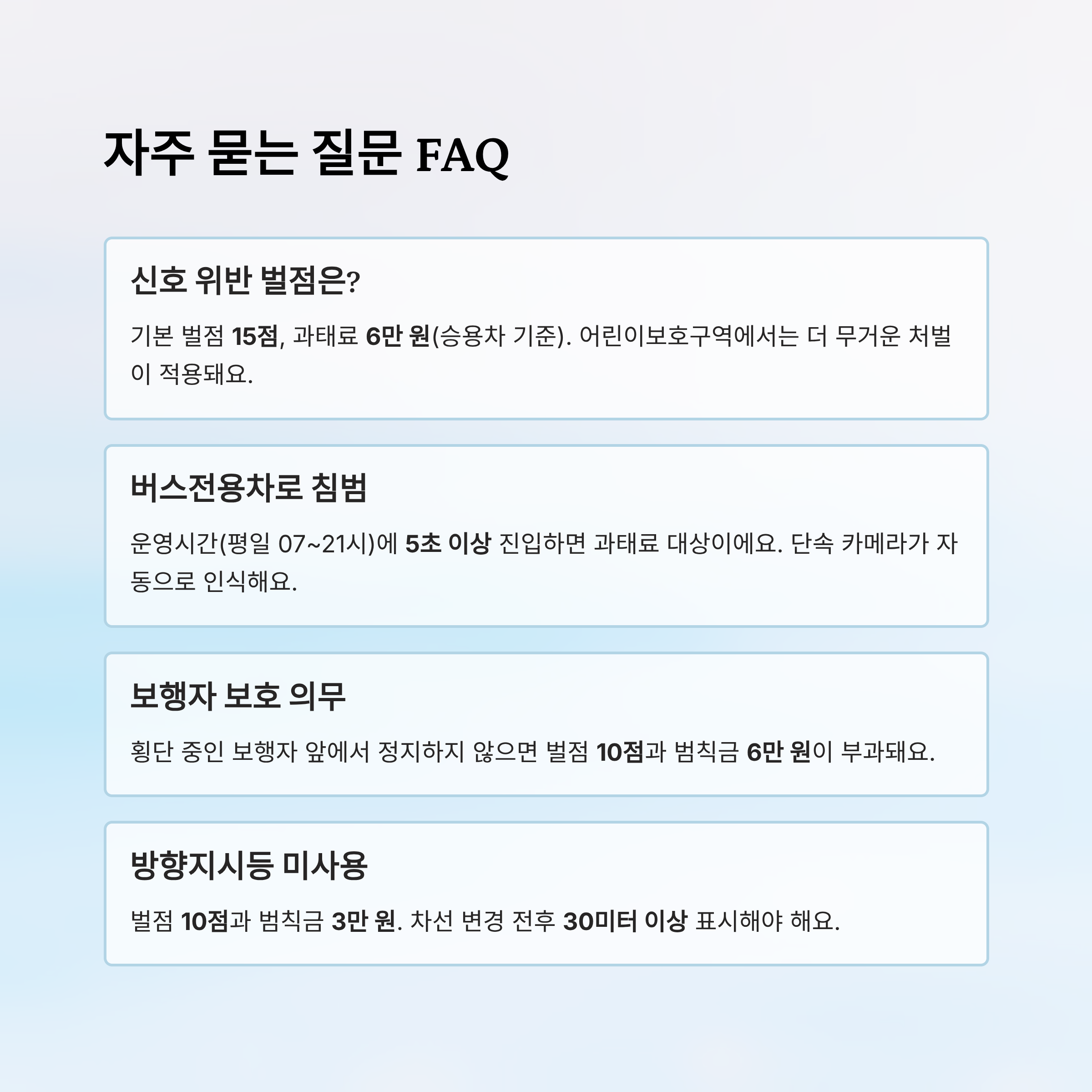 A6. 맞아요! 보호구역 내 위반은 과태료가 2배, 벌점도 높아요. 심한 경우 형사처벌까지 가능하니 반드시 조심해야 해요.