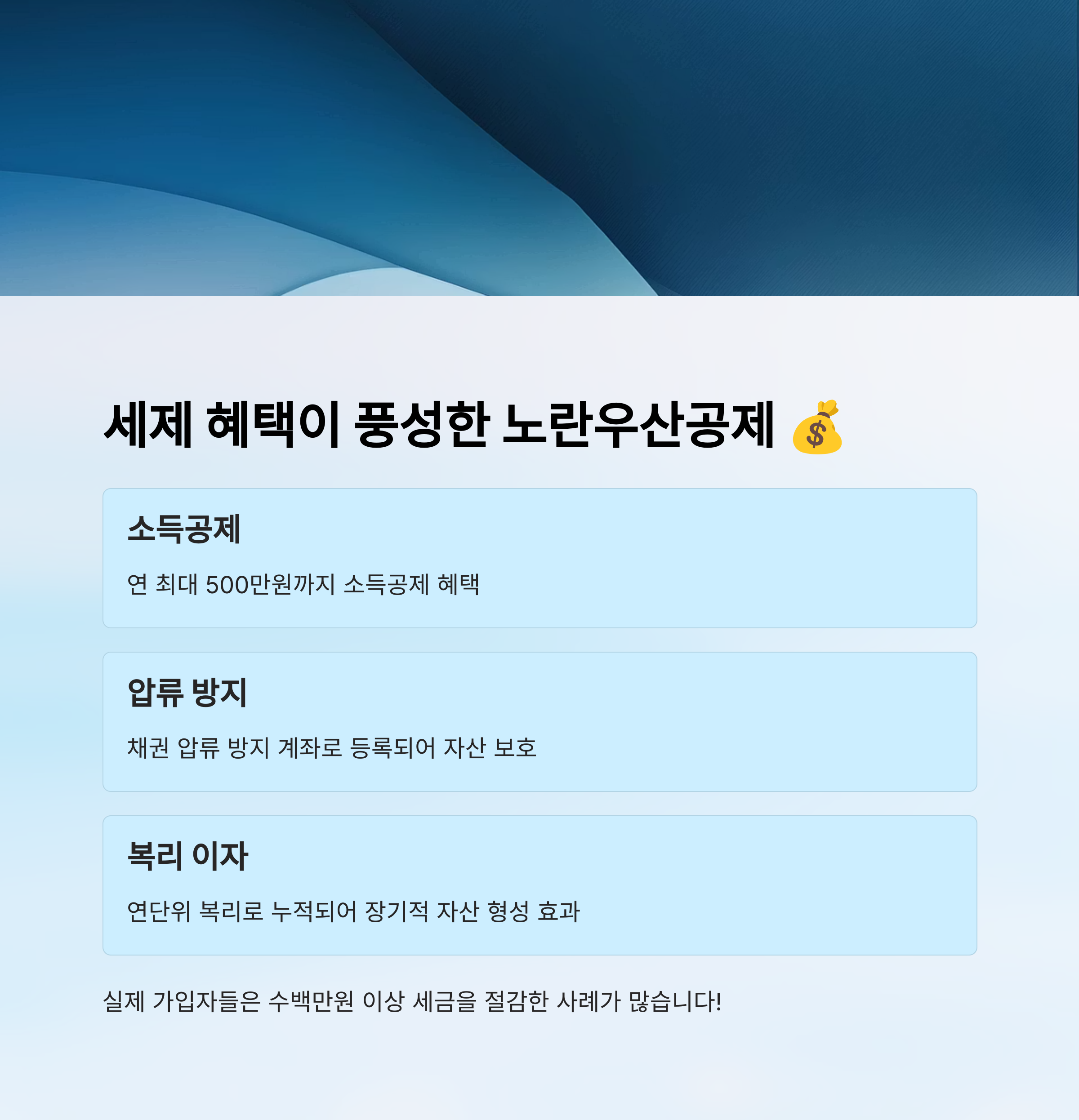 이자 수익 역시 기대할 만해요. 공제금은 예금이나 채권 등 안정적인 금융상품에 투자되어, 꾸준히 이자를 지급해준답니다. 복리로 운용되므로, 장기적으로 큰 자산으로 성장할 수 있어요.