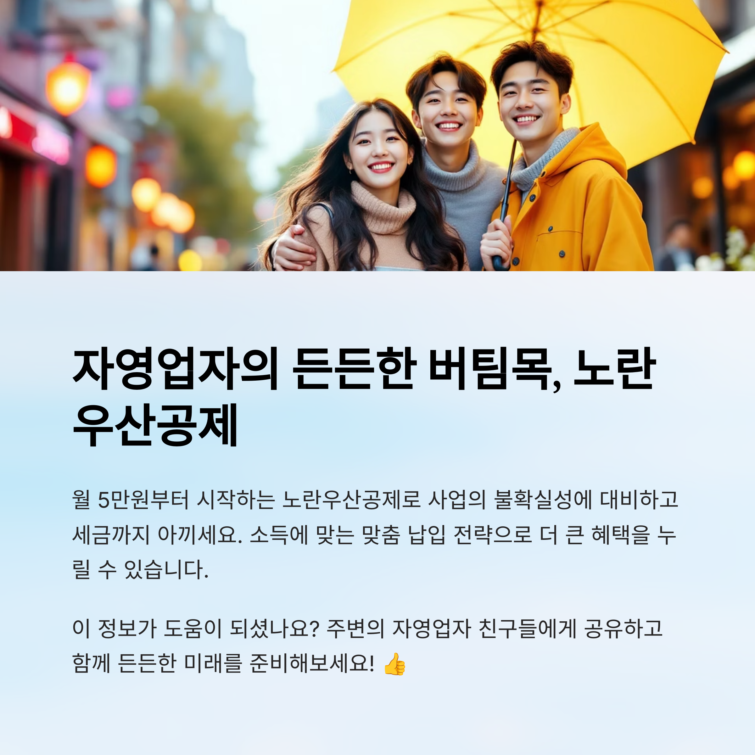 내가 생각했을 때 이 제도는 ‘자영업자 보험’이라 부를 수 있을 정도로 든든한 제도예요. 특히 사회보험 혜택이 부족한 소상공인들에게 꼭 필요한 제도가 아닐까 싶어요.