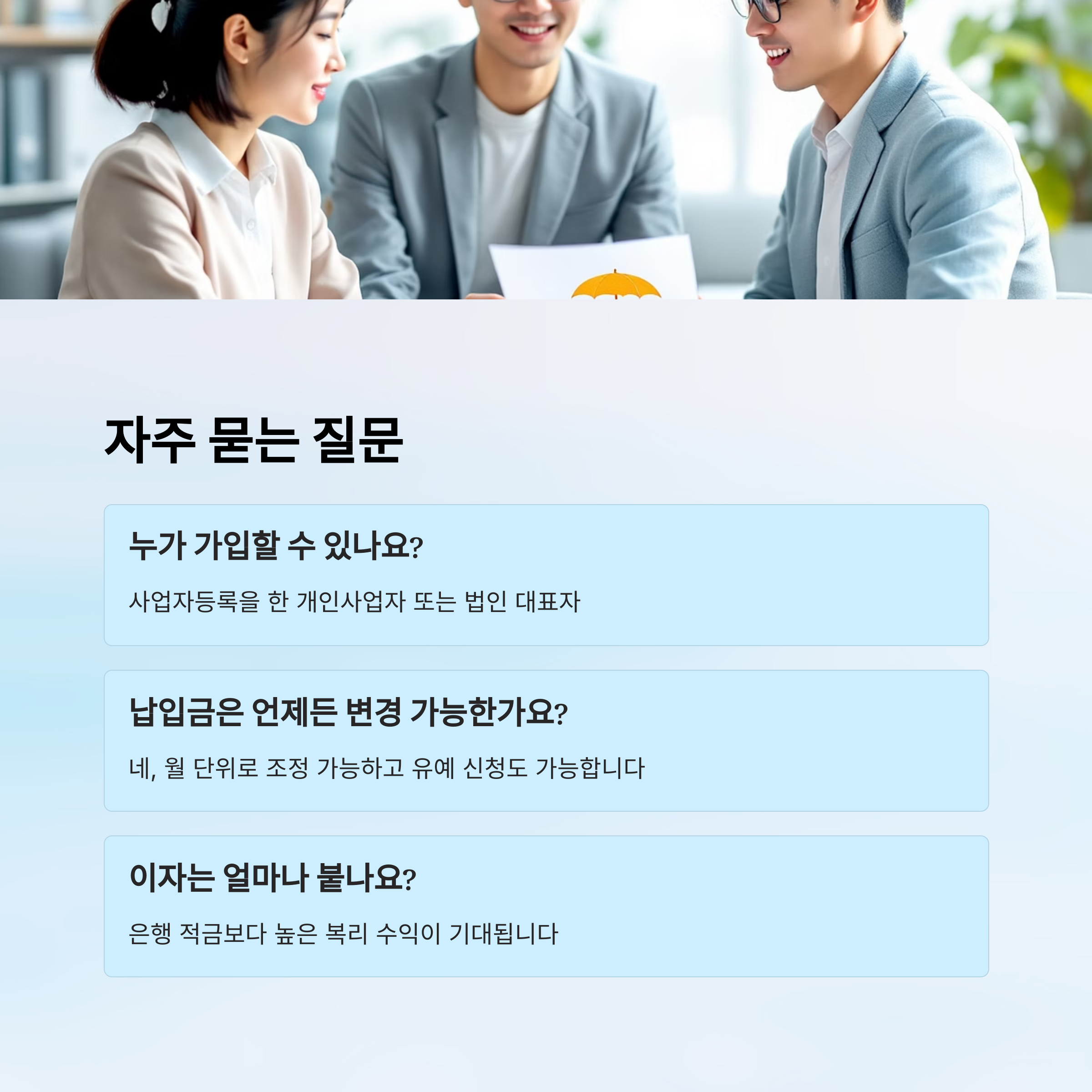 A1. 사업자등록을 한 개인사업자 또는 법인 대표자라면 대부분 가입할 수 있어요. 단, 근로소득자나 직장인은 가입 대상이 아니에요.