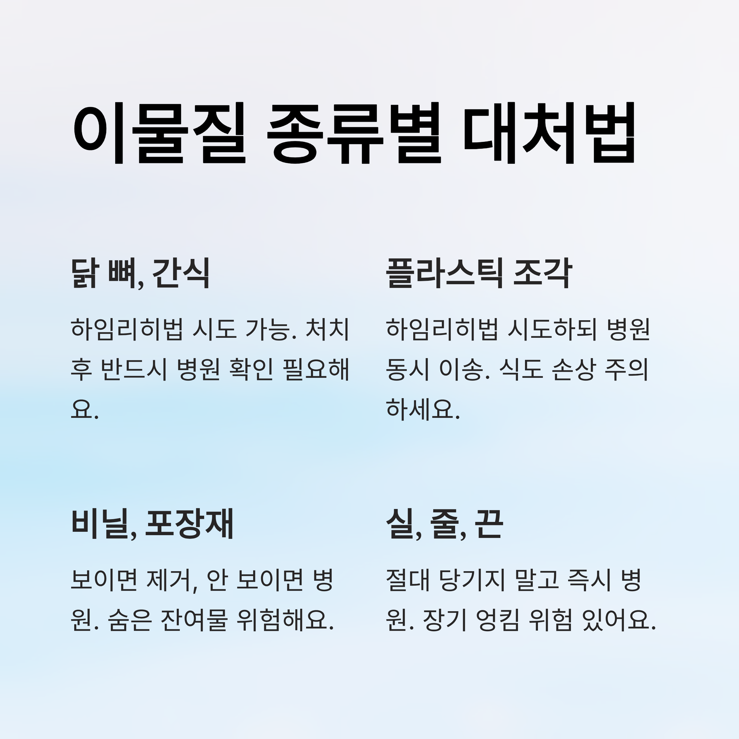 | 비닐, 랩, 포장재 | 보이면 제거, 보이지 않으면 병원 | 숨은 잔여물 주의 |