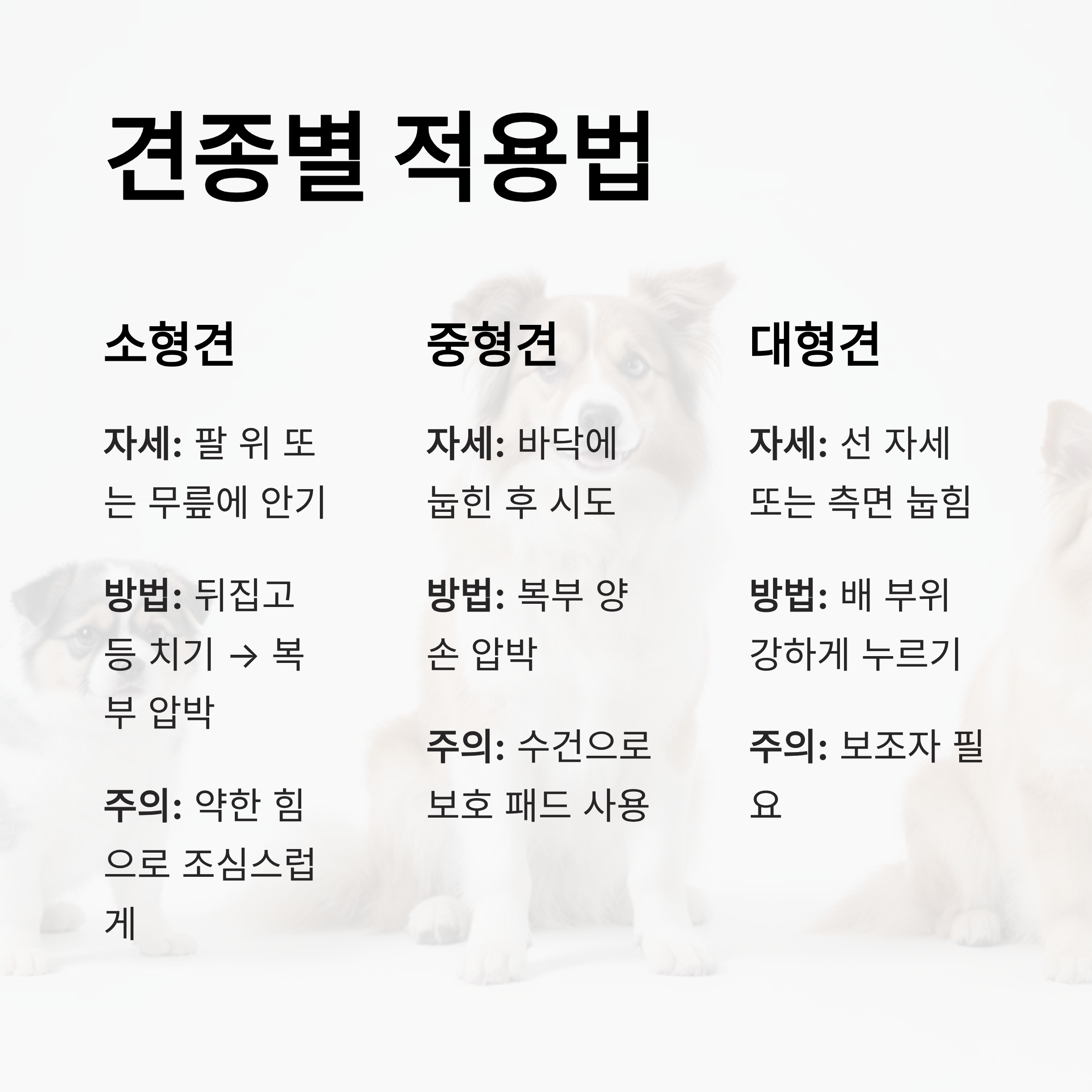 A1. 네, 원칙적으로는 모든 강아지에게 적용할 수 있지만, 소형견과 대형견은 자세나 압박 방식이 달라요. 특히 소형견은 힘을 약하게, 대형견은 눕힌 자세로 시행하는 것이 중요해요.