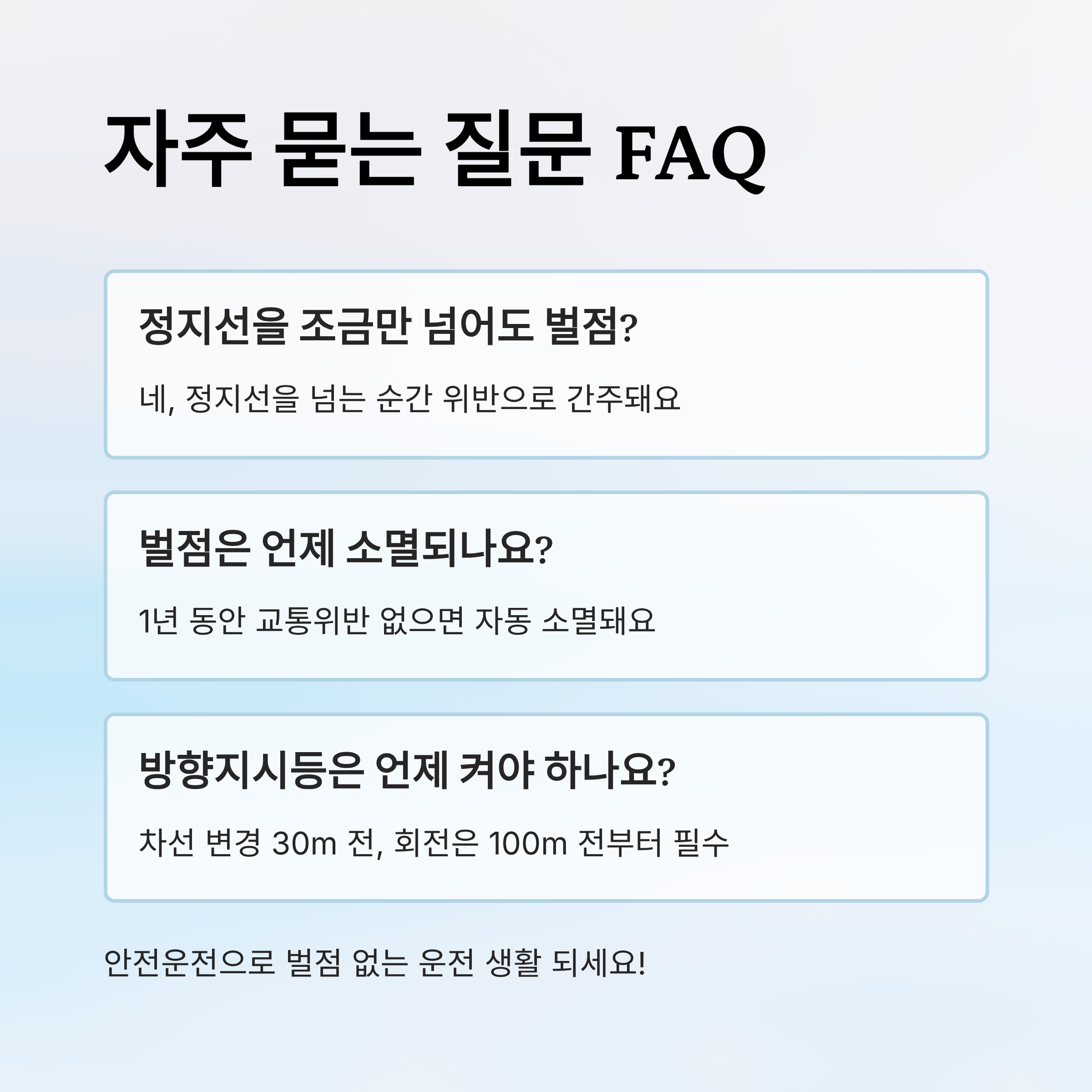 이런 기본적인 내용만 정확히 지켜도 벌점 없이 운전하는 건 절대 어렵지 않아요. 작은 습관이 안전 운전을 만들어줘요! 🚗