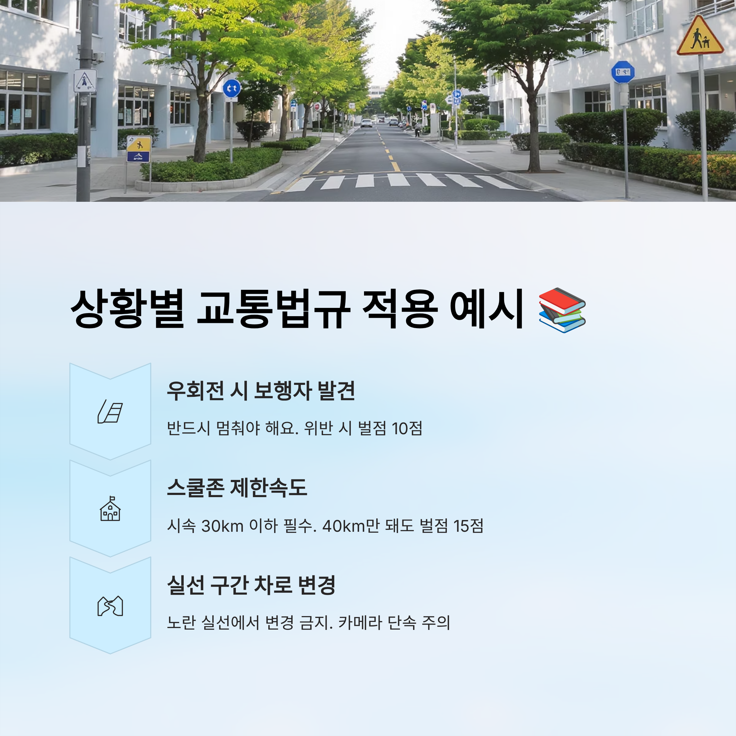 운전자라면 특히 **보행자 보호법**, **스쿨존 규정**, **차로 변경 시 예고 운전** 같은 항목에 주의를 기울여야 해요. 조금 귀찮더라도 이런 항목을 점검하는 습관이 결국 벌점 없는 운전으로 이어지거든요.