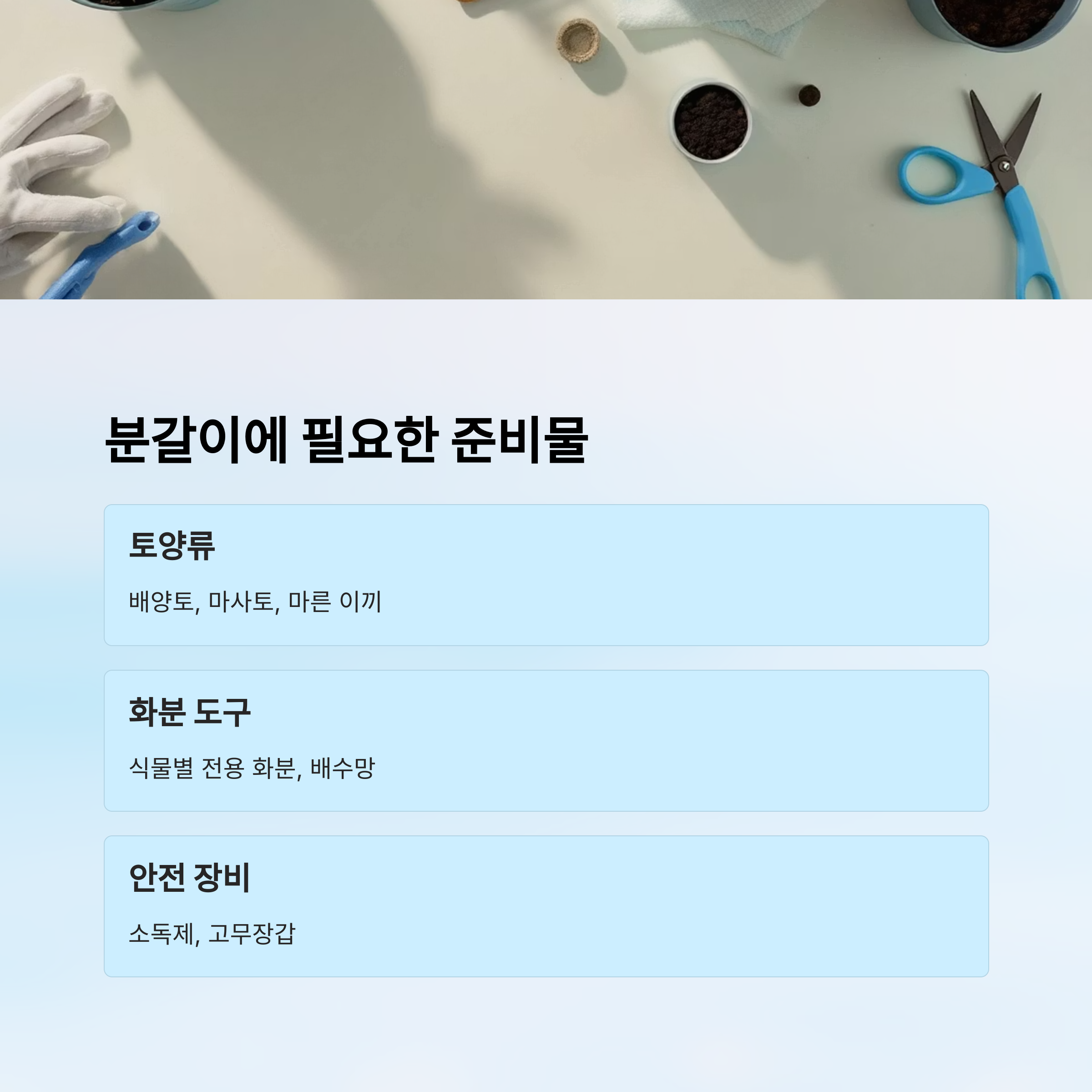 분갈이를 잘 하려면 사전에 준비물이 꼭 필요해요. 적절한 준비 없이 분갈이를 시도하면 흙을 흘리거나, 식물이 손상되기 쉬워요. 미리 체크리스트를 만들어 준비해두면 정말 편하답니다!