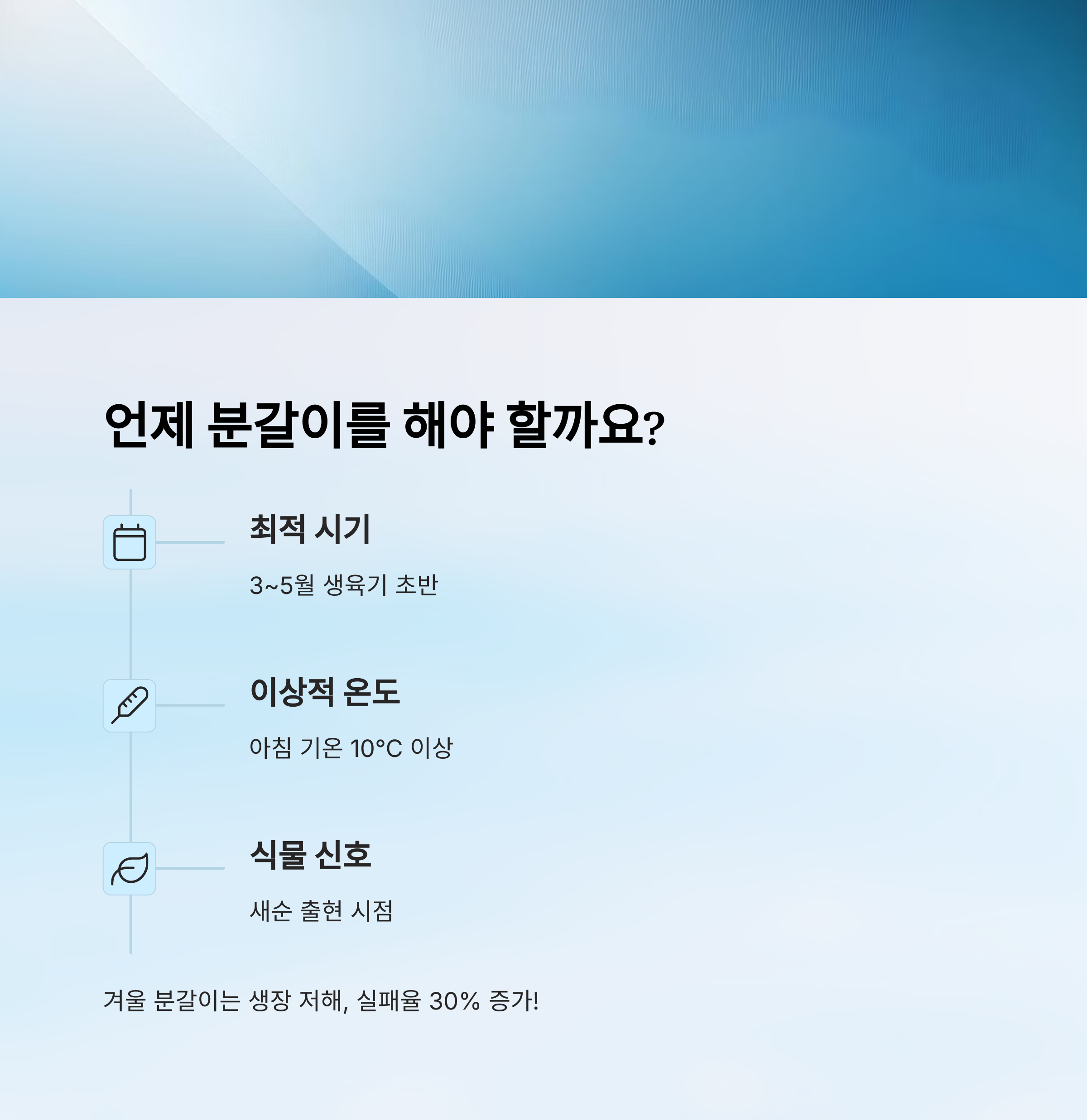 A8. 지금이 봄이라면 최고의 시기예요! 식물 성장 에너지가 활발해지기 시작하는 타이밍이라 딱 좋답니다.