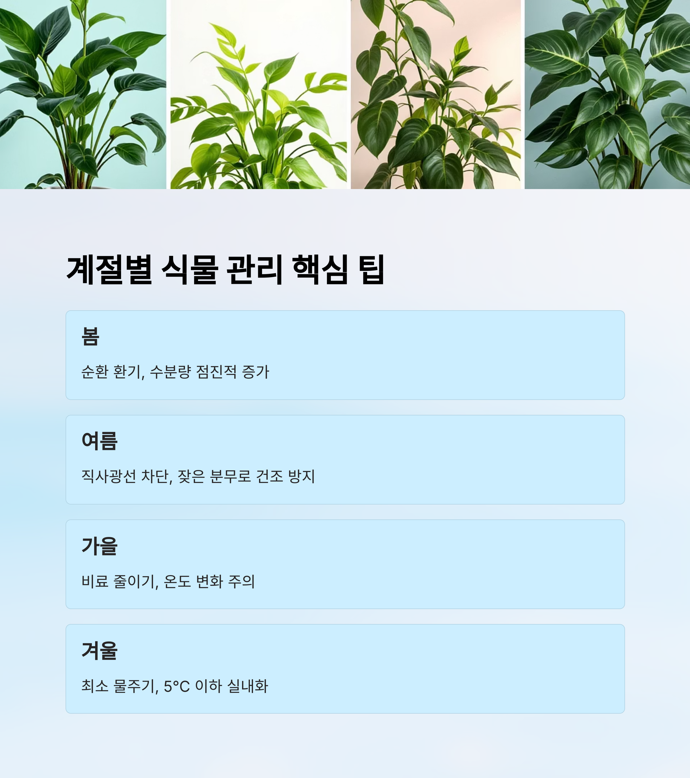 계절마다 식물이 요구하는 환경은 달라요. 봄에는 성장이 시작되기 때문에 영양 공급과 분갈이가 필요하지만, 여름에는 수분 관리와 해충 예방이 더 중요해요. 특히 여름엔 냉방기 영향으로 잎이 마르거나 말려버리는 경우가 많아요.