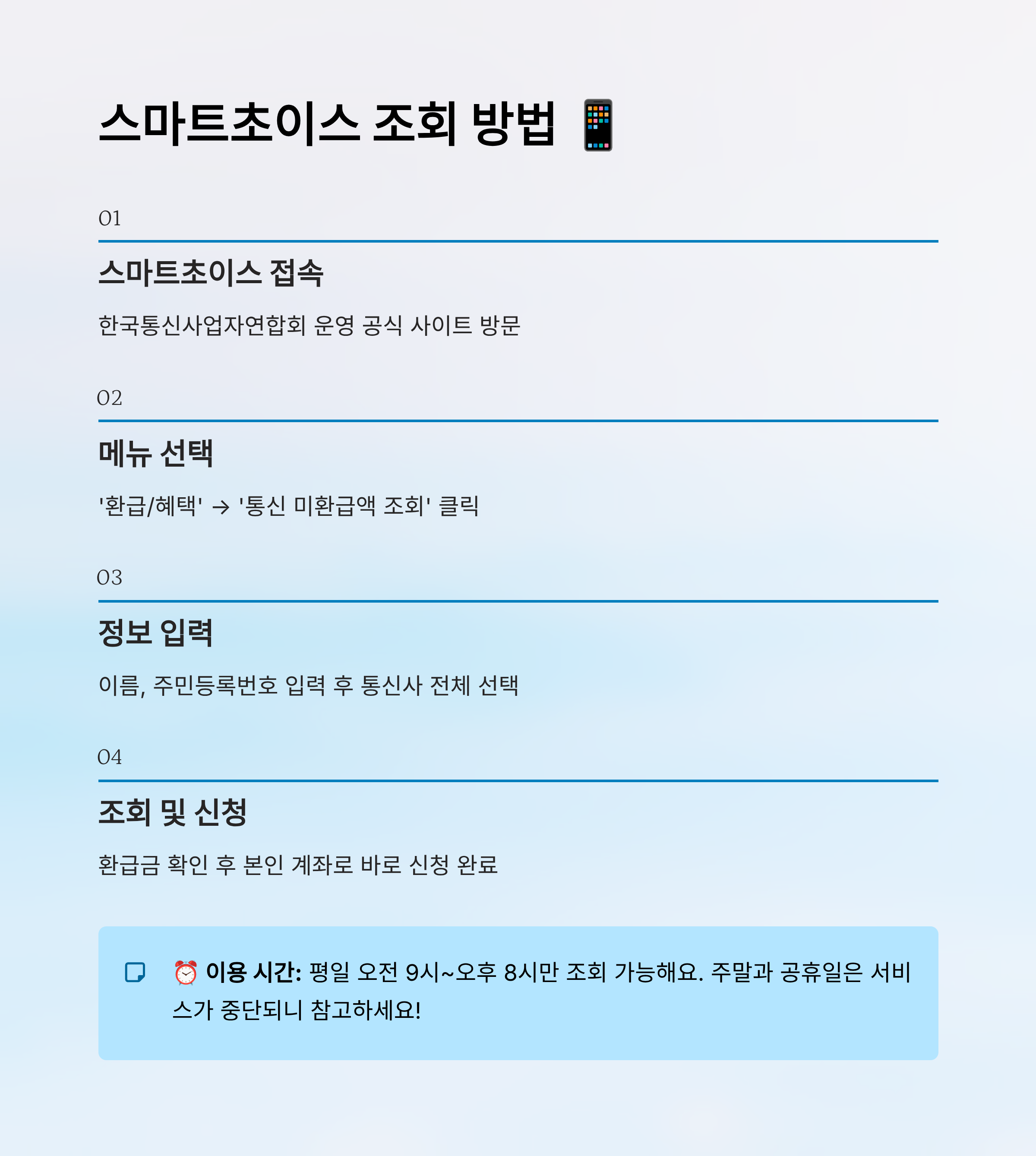 이 제도는 한국통신사업자연합회(KTOA)가 운영하는 ‘스마트초이스’라는 사이트에서 간편하게 조회하고 환급 신청까지 가능해요. 이름과 주민등록번호만 입력하면 내 이름으로 된 환급금이 있는지 알 수 있답니다. 조회 후 바로 환급까지 신청하면 끝! 정말 간단해요. 😊