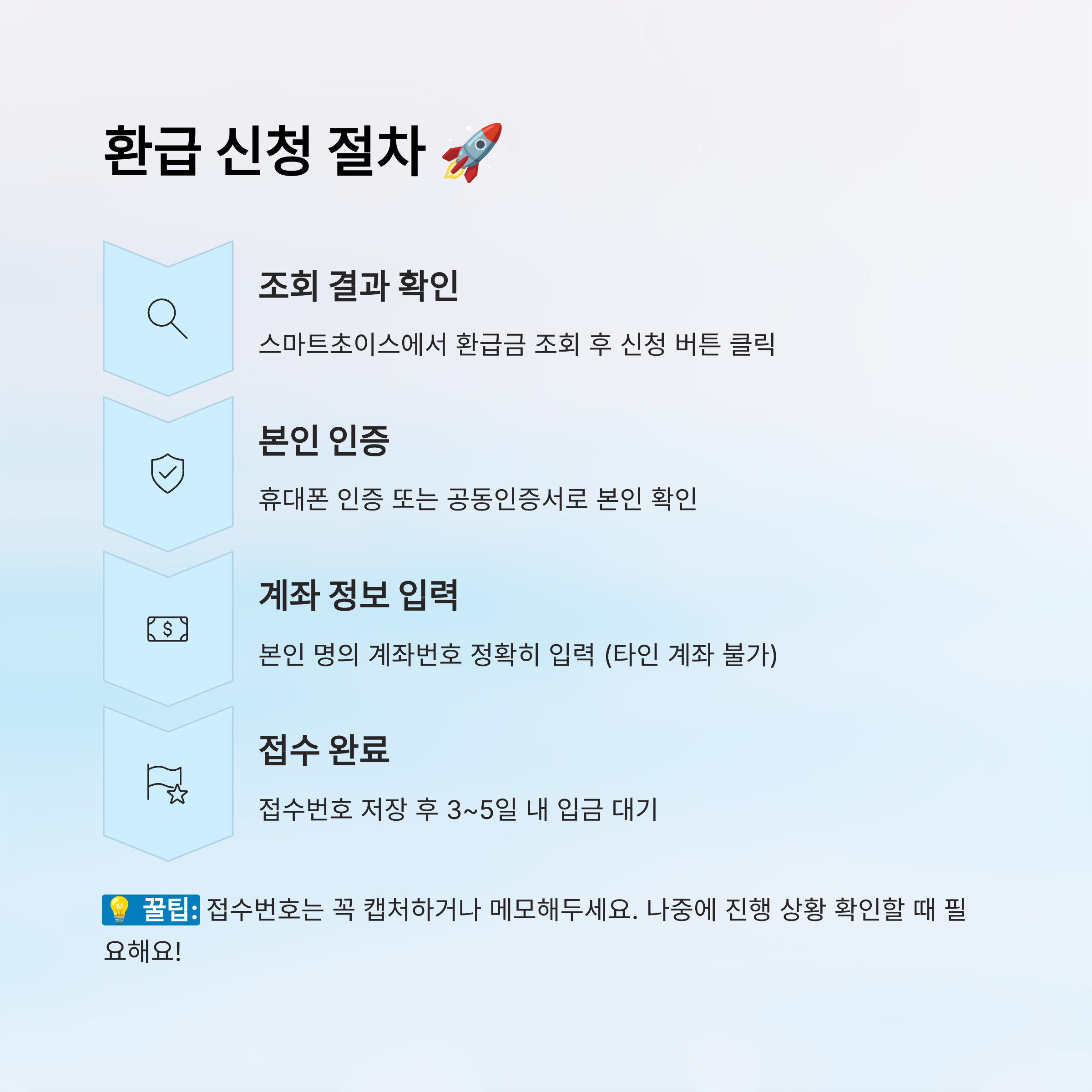 조회 결과에서 환급금이 있을 경우, 바로 이어서 본인 명의의 계좌 정보를 입력하면 환급 신청이 완료돼요. 대리인 명의의 계좌나 타인의 계좌는 인정되지 않기 때문에 반드시 본인 계좌여야 해요. 이 점은 꼭 유의해주세요. 🔐