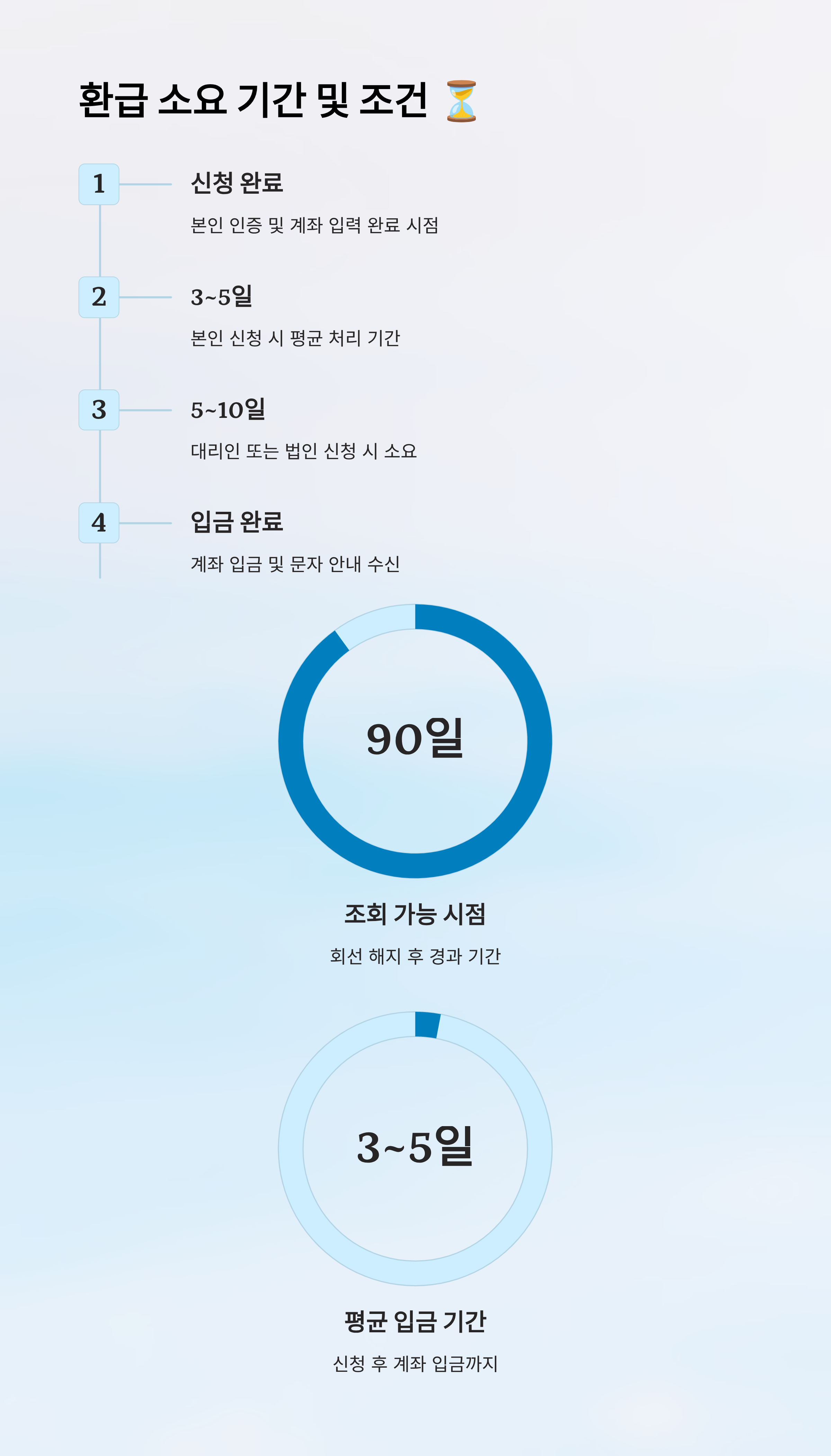 조회된 환급금이 있다는 것 자체가 이미 환급 대상 조건을 충족한 거예요. 조회 자체가 안 된다면 아직 90일이 안 지났거나, 환급금이 발생하지 않은 상태일 수 있어요. 불필요한 걱정은 잠시 내려놓으셔도 돼요. 😊