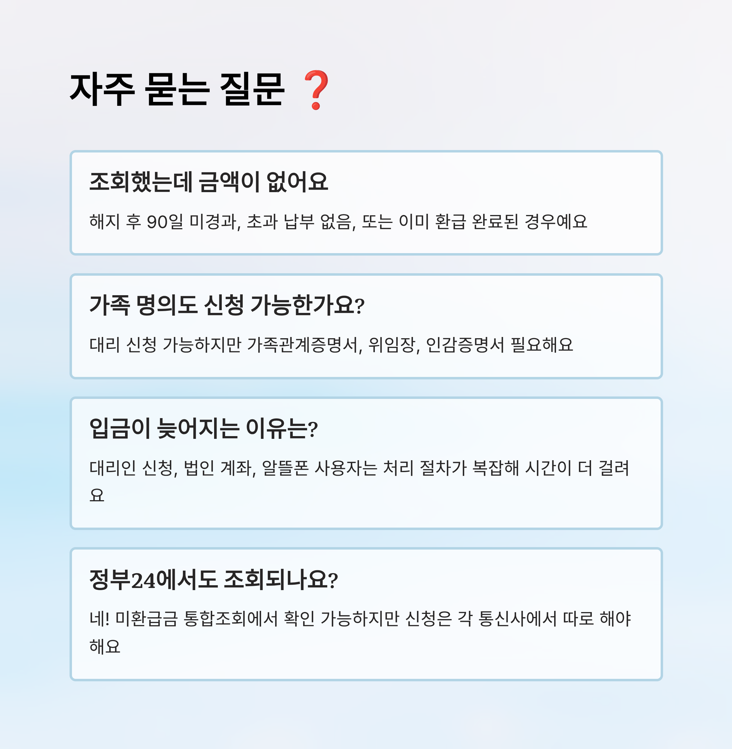 또 하나 꼭 알아둬야 할 사실은, 회선 해지 후 90일이 지나야 조회 및 환급 신청이 가능하다는 점이에요. 오늘 회선을 해지했다고 바로 환급 조회가 되는 건 아니라는 뜻이에요. 예전 통신사를 떠올리며 ‘아직 90일 지났나?’ 체크해보세요! 📅