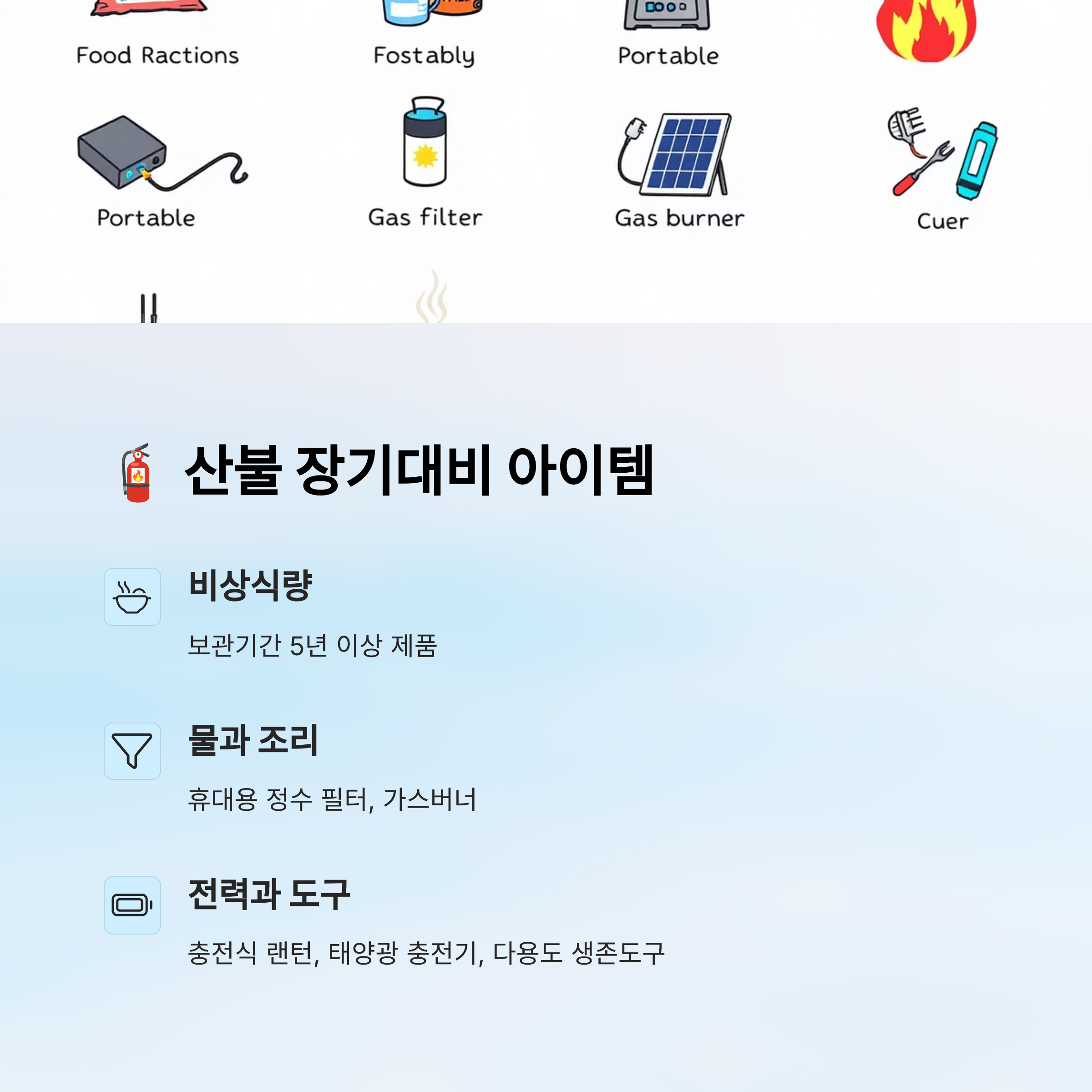 산불은 한 번 발생하면 진압까지 며칠이 걸리기도 해요. 그래서 짧은 시간만을 대비하는 게 아니라 '장기 생존'을 위한 아이템도 꼭 준비해야 해요. 특히 외부에 고립되는 상황까지 가정해야 해요.