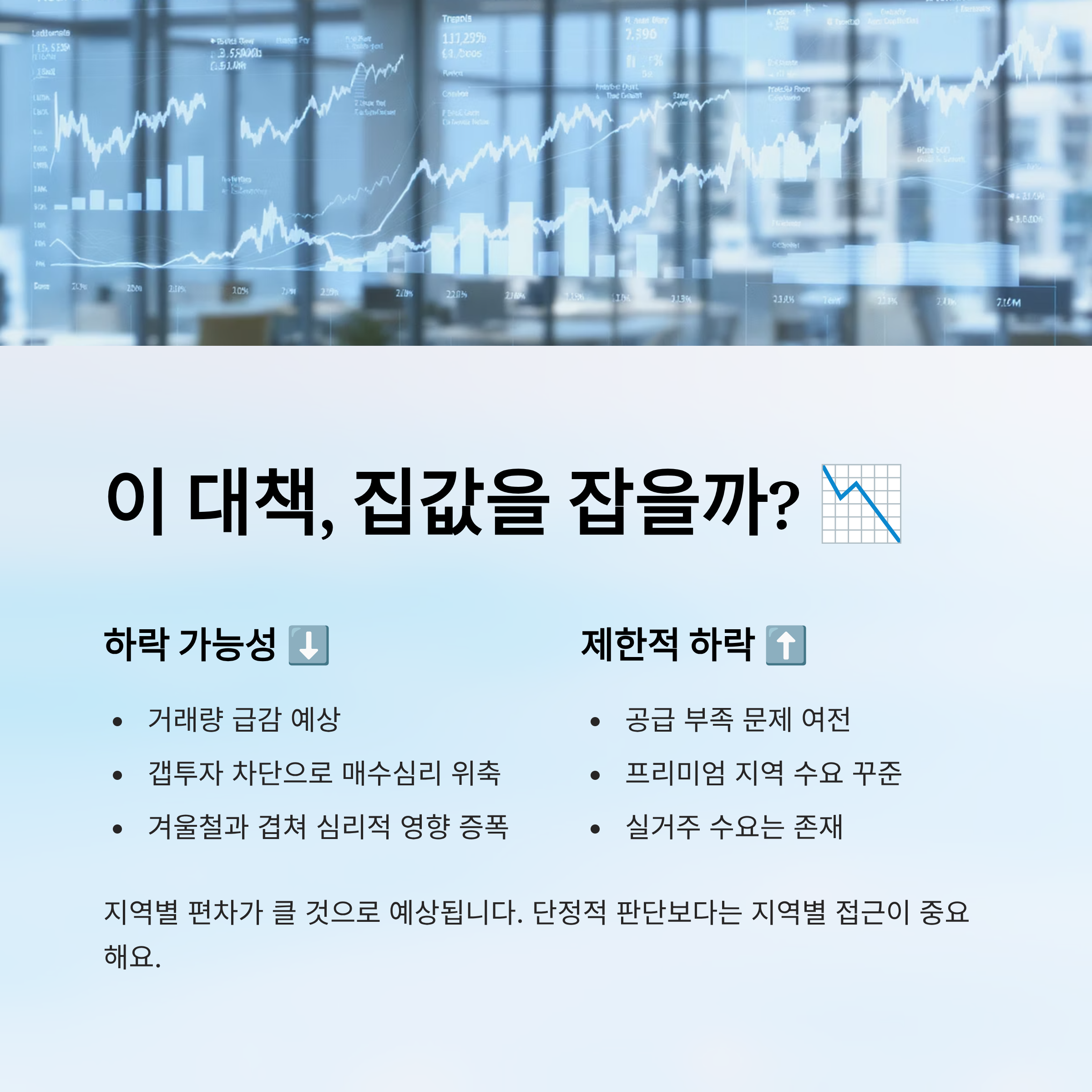 전문가들은 단기적으로는 거래량 급감이 나타나고, 일부 지역에서는 가격 조정이 이뤄질 수 있다고 보고 있어요. 실거주 요건 강화로 '갭투자'가 막히면서 서울 및 인기 지역의 매수심리가 위축될 수밖에 없죠. 특히 거래가 뜸한 겨울철과 겹치면서 심리적 영향은 더욱 커질 가능성이 있어요.