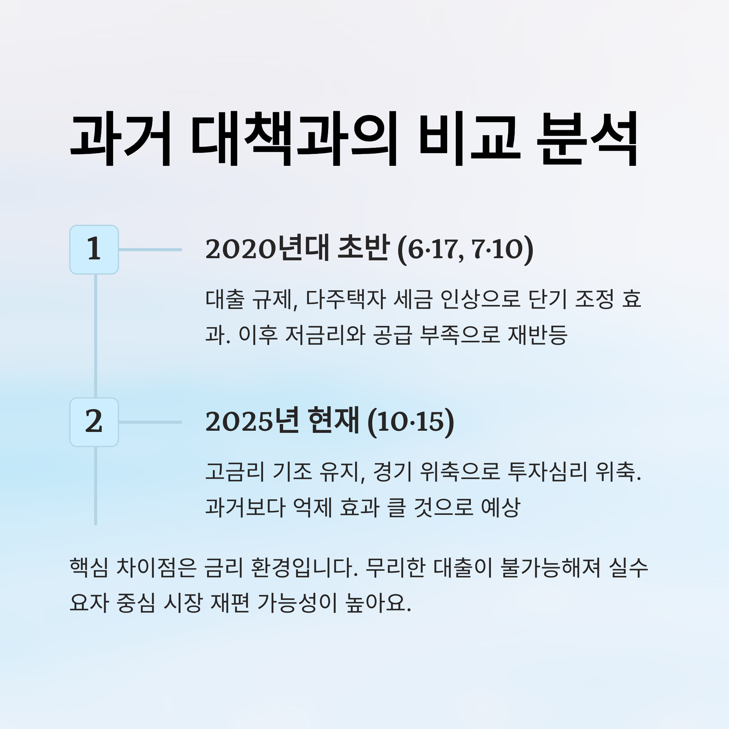 이번 10·15 대책은 2020년대 초반 시행된 6·17, 7·10 대책과 유사한 맥락이 있어요. 당시에도 대출 규제, 규제지역 확대, 다주택자 세금 인상이 핵심이었고, 실제로 단기적 가격 조정 효과가 있었어요. 그러나 이후 다시 반등한 배경에는 저금리와 공급 부족이 있었죠.