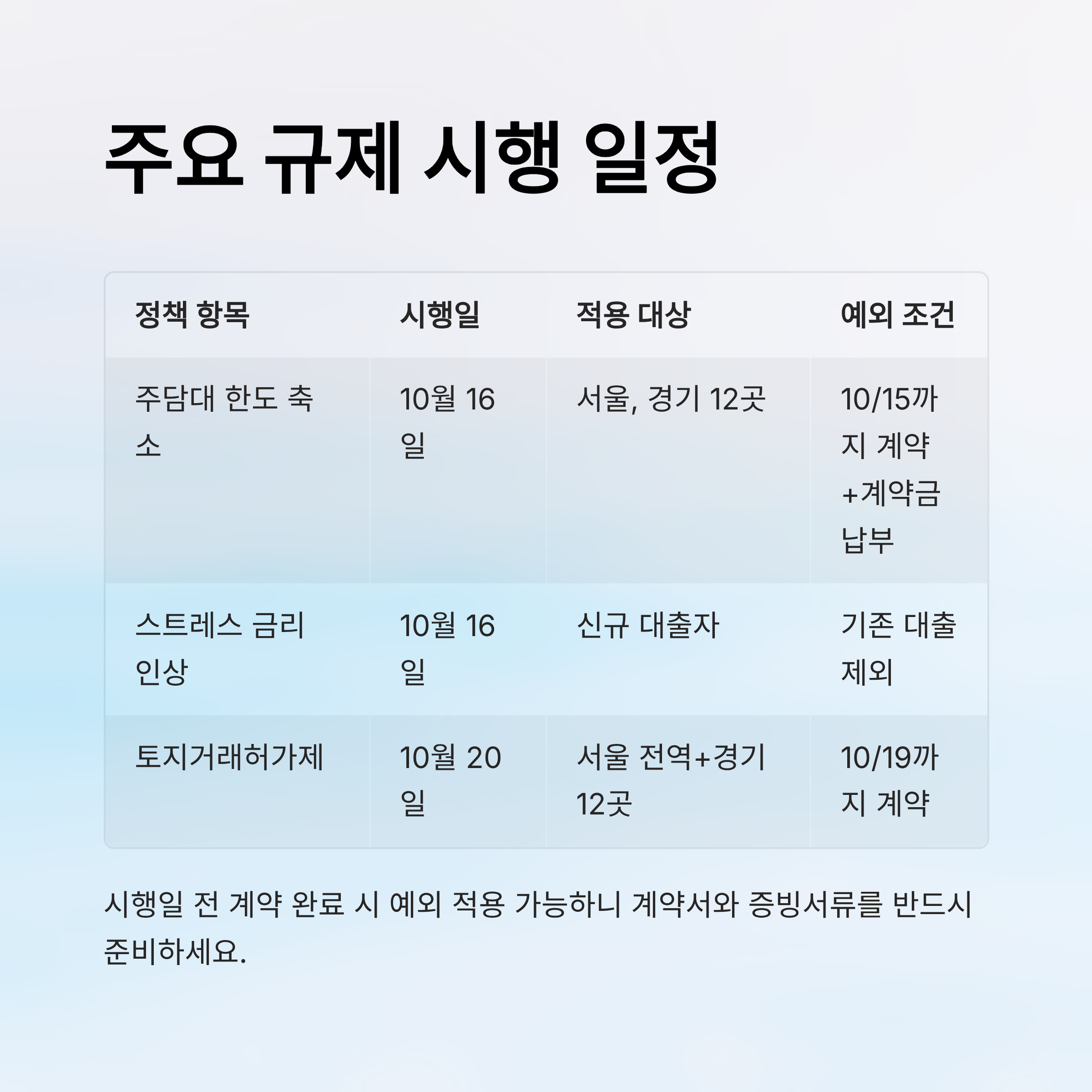| 토지거래허가제 | 10월 20일 | 서울 전역 + 경기 12곳 | 10월 19일까지 계약 시 면제 |