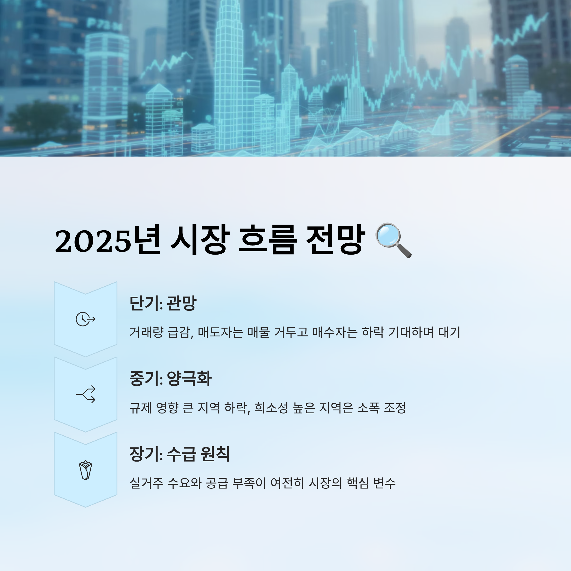 중장기적으로는 지역별 양극화가 심화될 수 있어요. 규제에 강하게 영향을 받는 지역은 하락세가 클 수 있지만, 입지가 우수하고 희소성이 높은 지역은 급매 중심으로 소폭 조정에 그칠 수도 있어요. 특히 재건축·재개발 지역은 규제와 공급 이슈가 동시에 작용해 복합적인 흐름이 나타날 수 있어요.