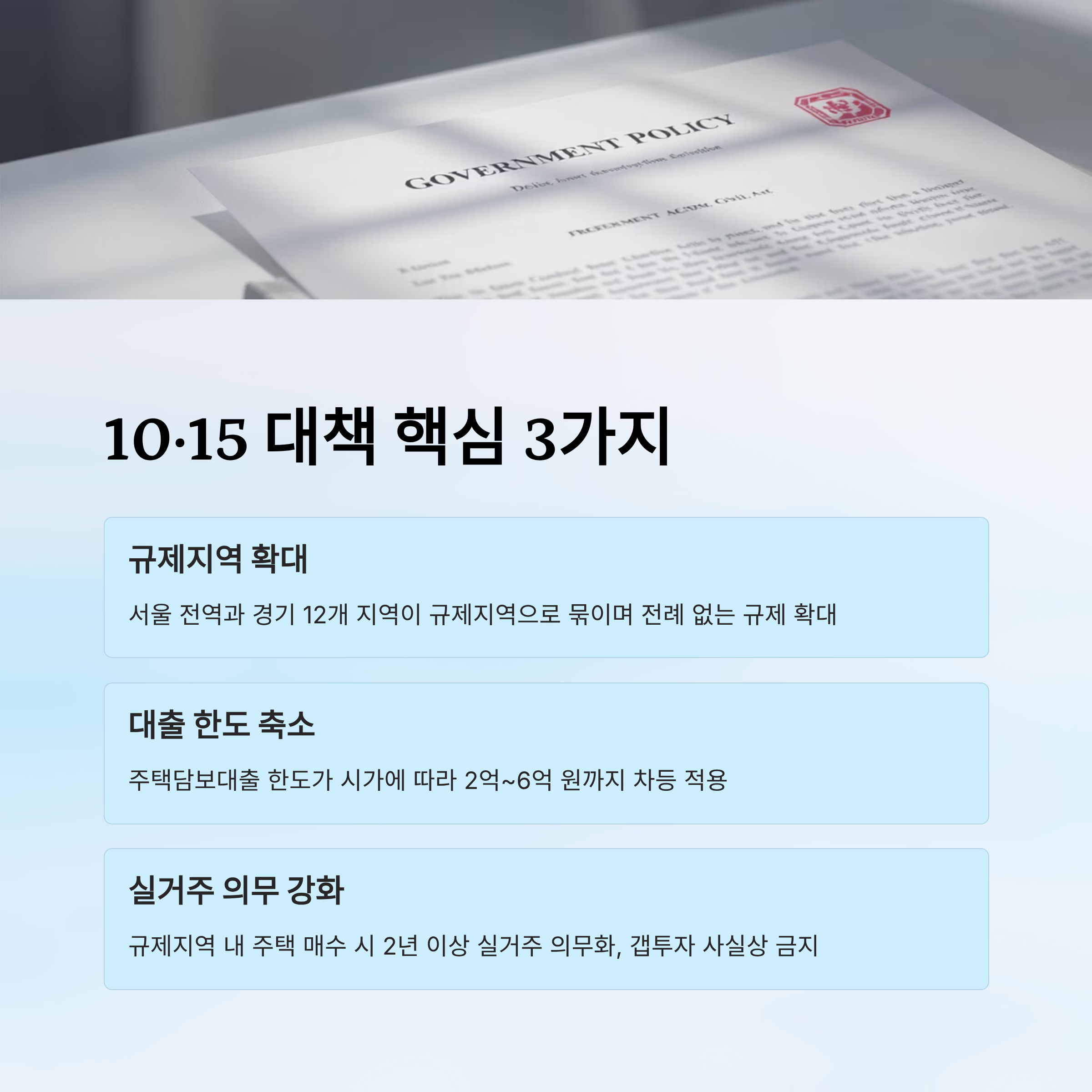 이번에 발표된 10·15 부동산 대책은 서울 및 수도권의 집값 급등을 진정시키기 위한 전방위적 규제예요. 핵심은 다음 세 가지예요. 첫째, 서울 전역과 경기 12개 지역이 규제지역으로 묶이며 전례 없는 규제 확대가 있었어요. 둘째, 주택담보대출 한도가 시가에 따라 2억~6억 원까지 차등 적용돼 사실상 고가 주택 구입이 매우 어려워졌죠.