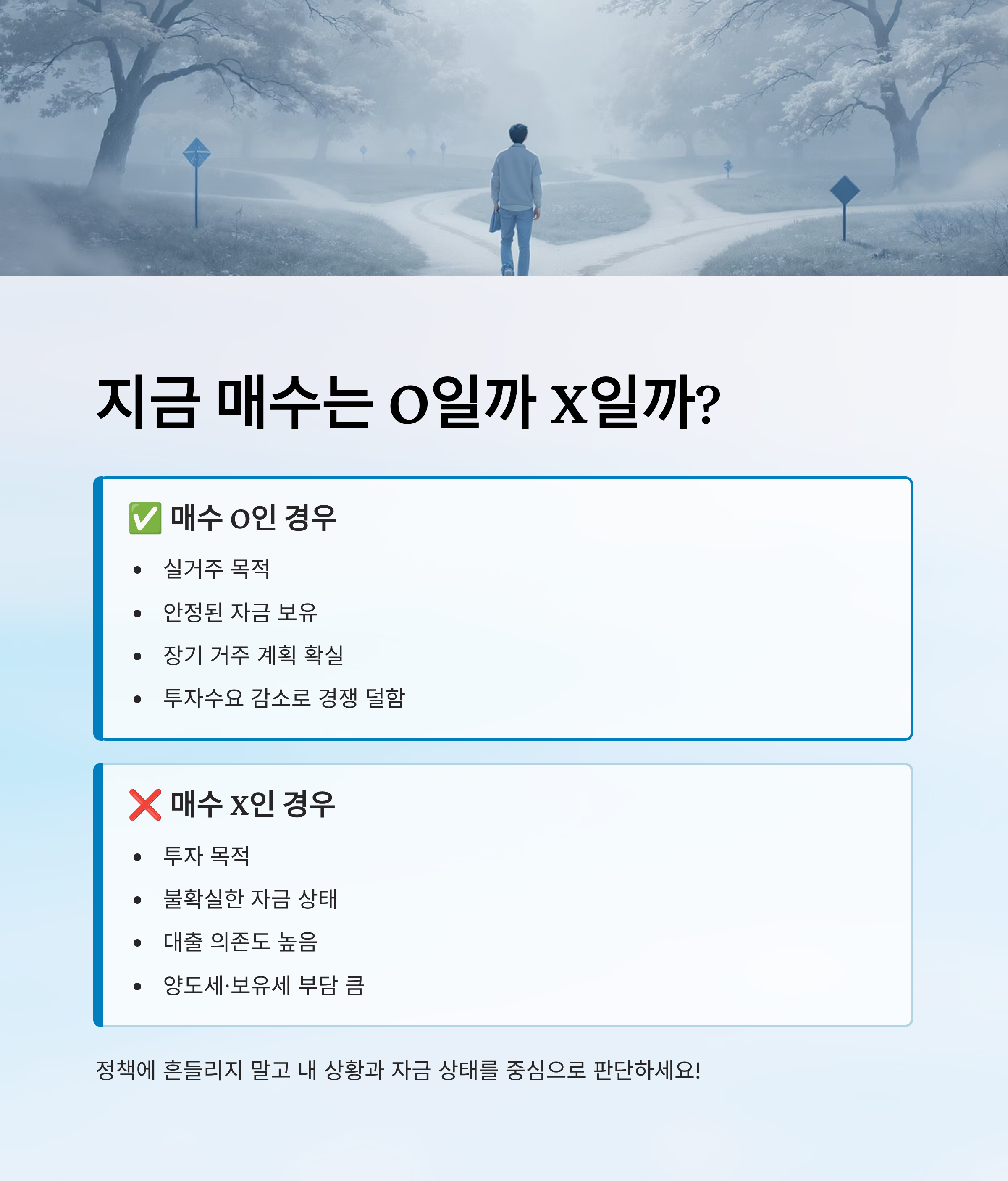 자, 이제 가장 궁금한 부분이에요. 지금이 집 사기 좋은 시기일까요? 정답은 개인의 상황에 따라 'O일 수도, X일 수도' 있어요. 전제조건은 딱 하나, 실거주 목적이냐 아니냐예요.