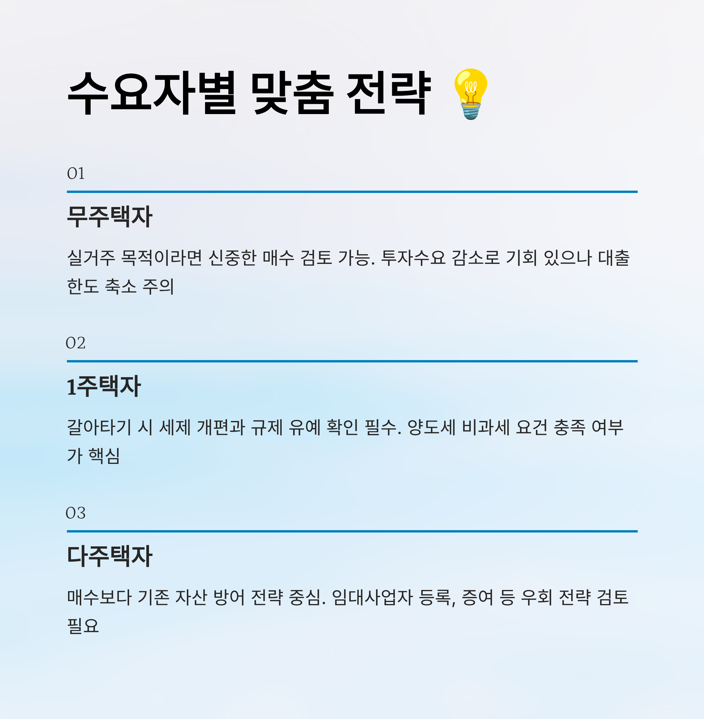 | 다주택자 | 보유 중심, 세금 대비 | 보유세, 규제 부담 |