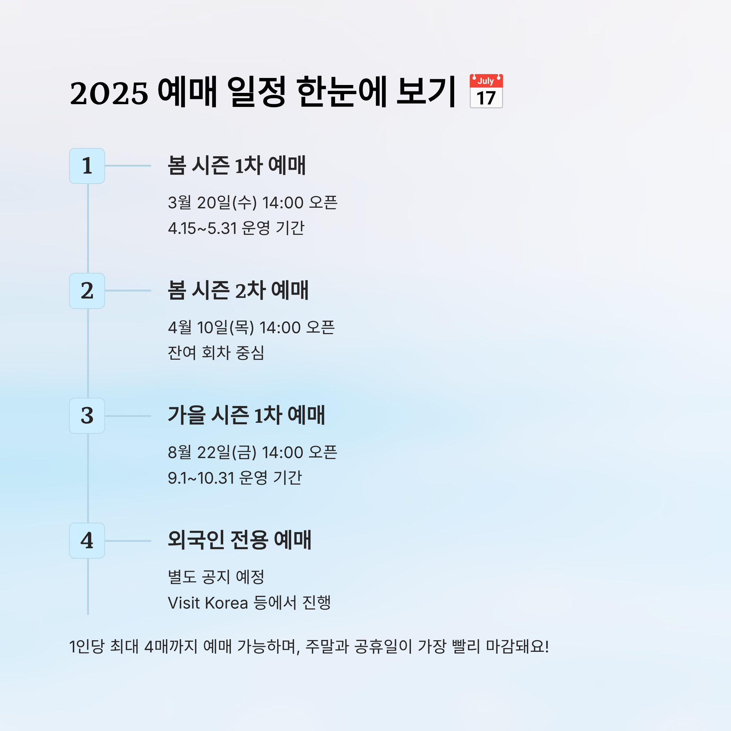 2025년 봄 예매 일정(예상 기준)은 다음과 같아요. 이 일정은 매년 유사하게 운영되므로 참고하시면 좋아요. 특히 외국인 대상 티켓 오픈일은 별도로 존재하니 주의가 필요해요!