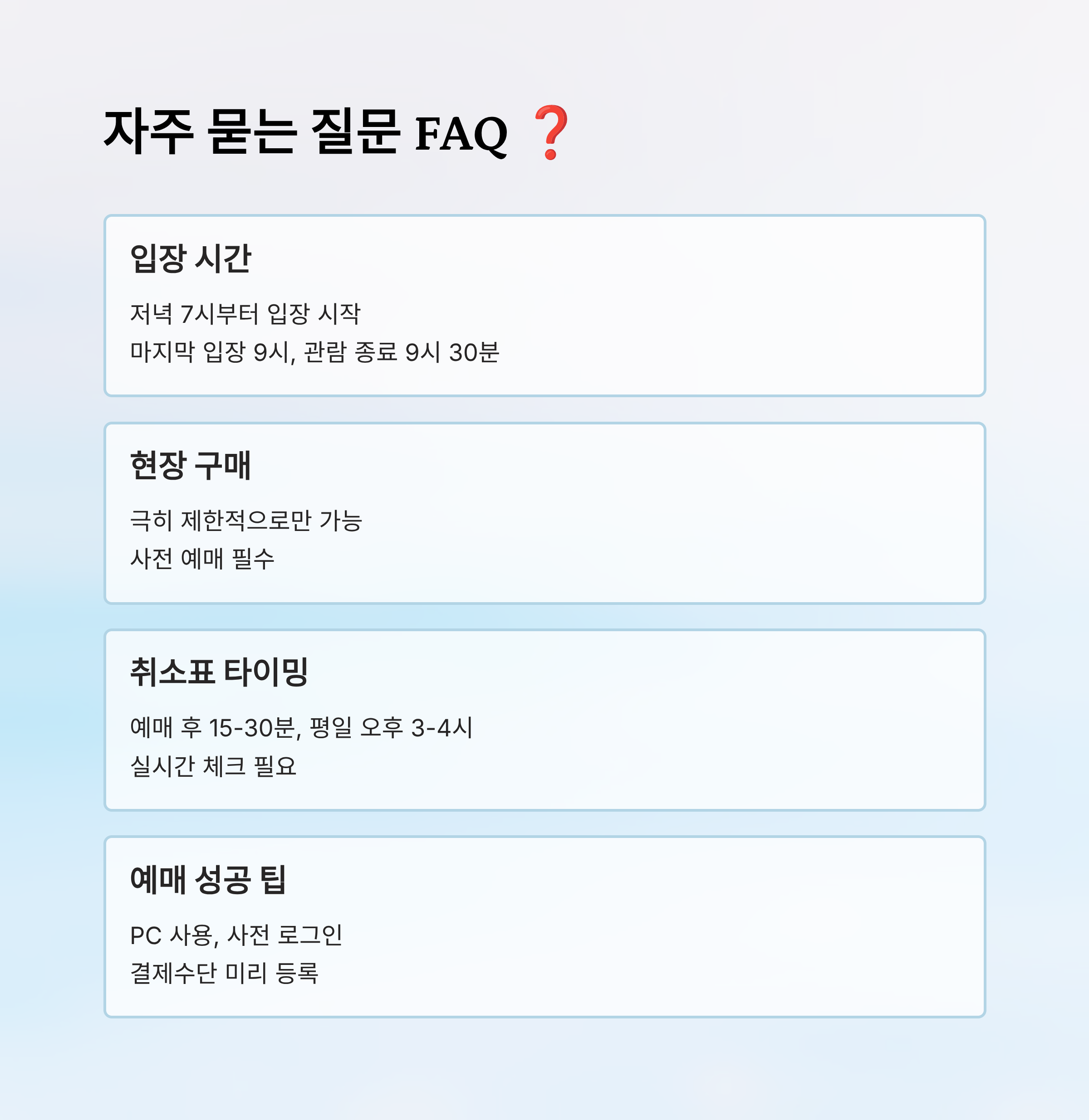A7. 사전 로그인, 결제수단 등록, 자동 새로고침 설정이 핵심이에요. PC로 예매하면 확률이 더 높아요!