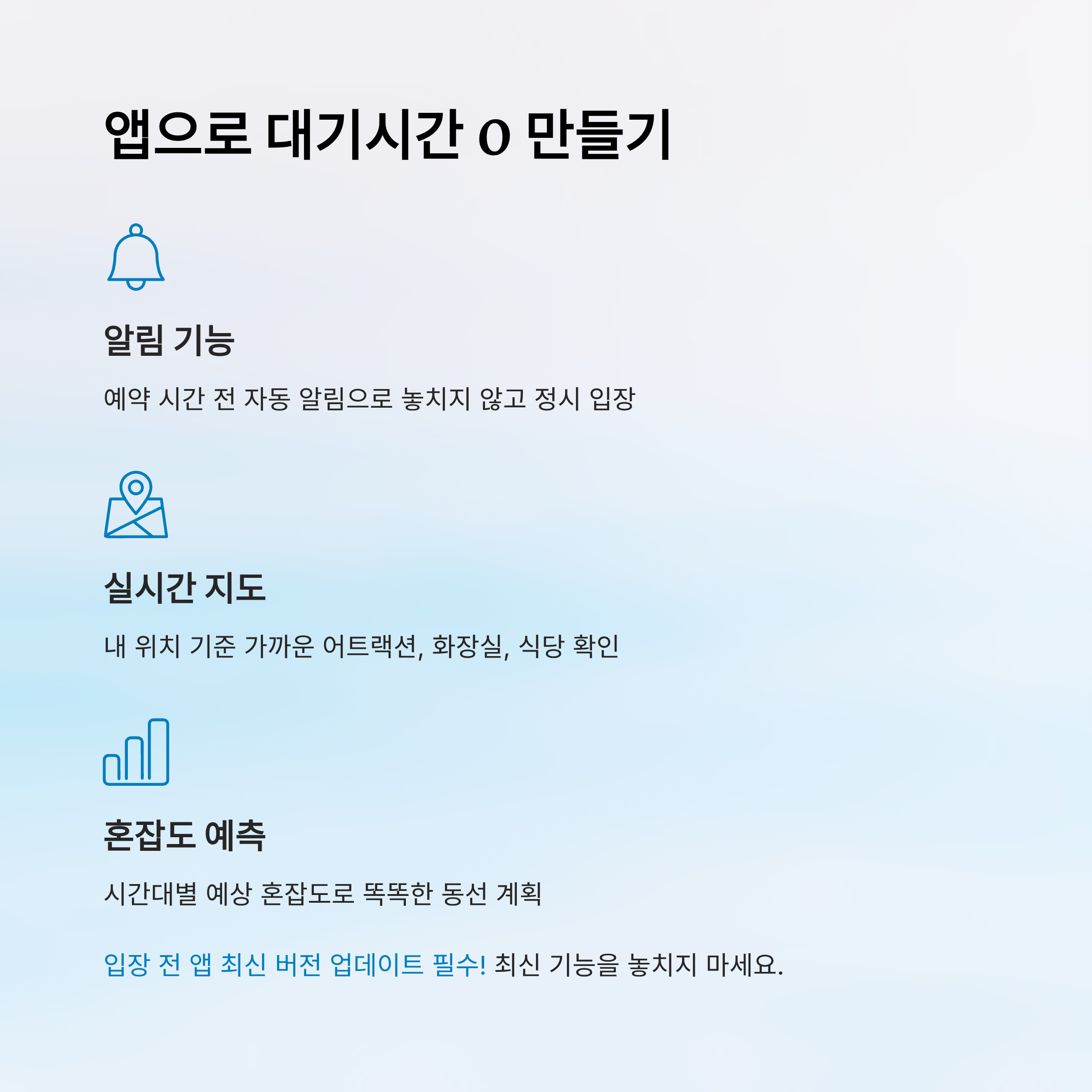 앱으로 대기시간 줄이기 핵심은 ‘빠른 확인’과 ‘빠른 이동’이에요. 어트랙션 위치와 시간대를 기준으로 미리 계획해두면 대기 없이 이동만으로 하루가 꽉 찬 느낌이에요. 💨