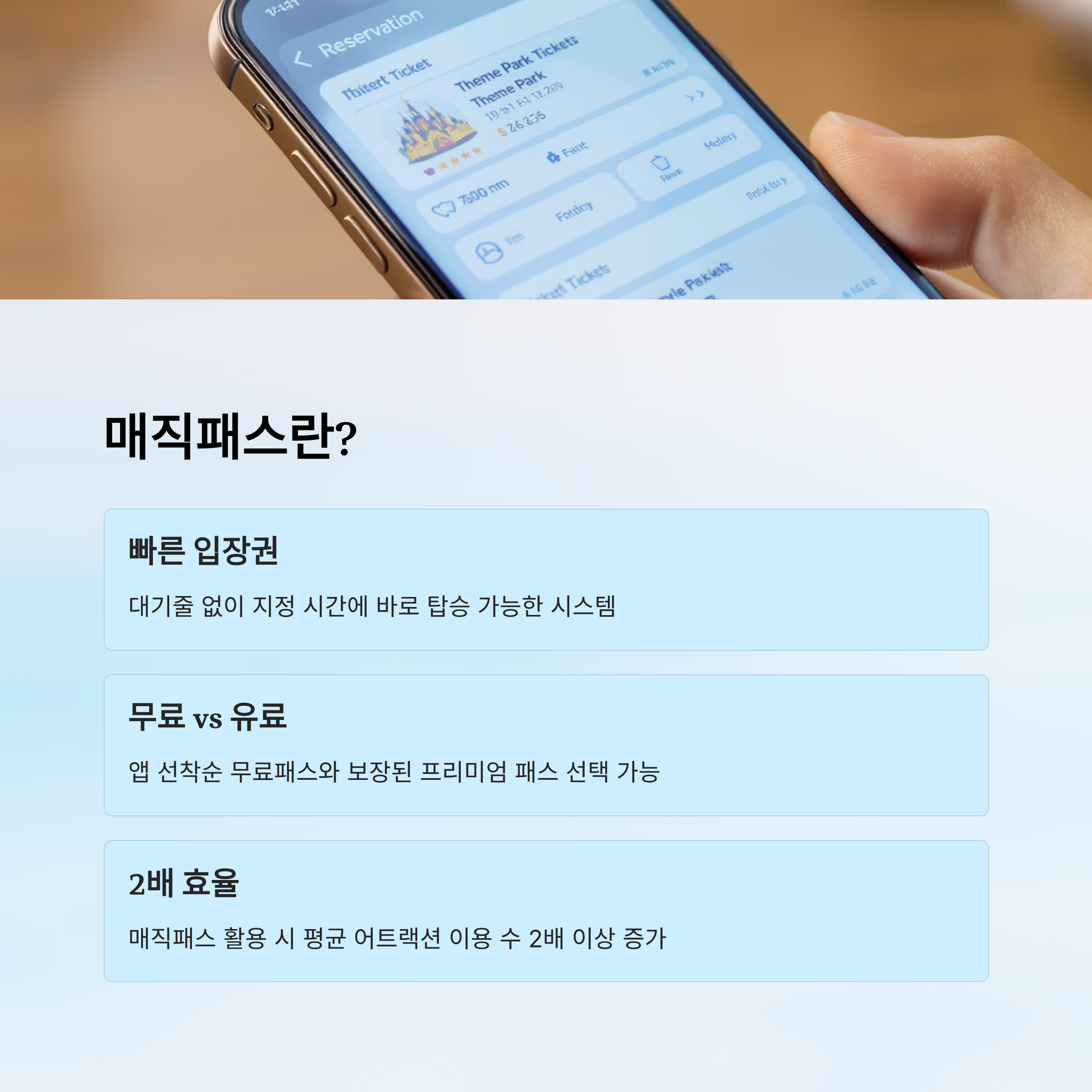 | 무료 매직패스 | 앱에서 선착순 예약 | 0원 | 앱 내 시간대 지정 | 일부 인기 어트랙션 |