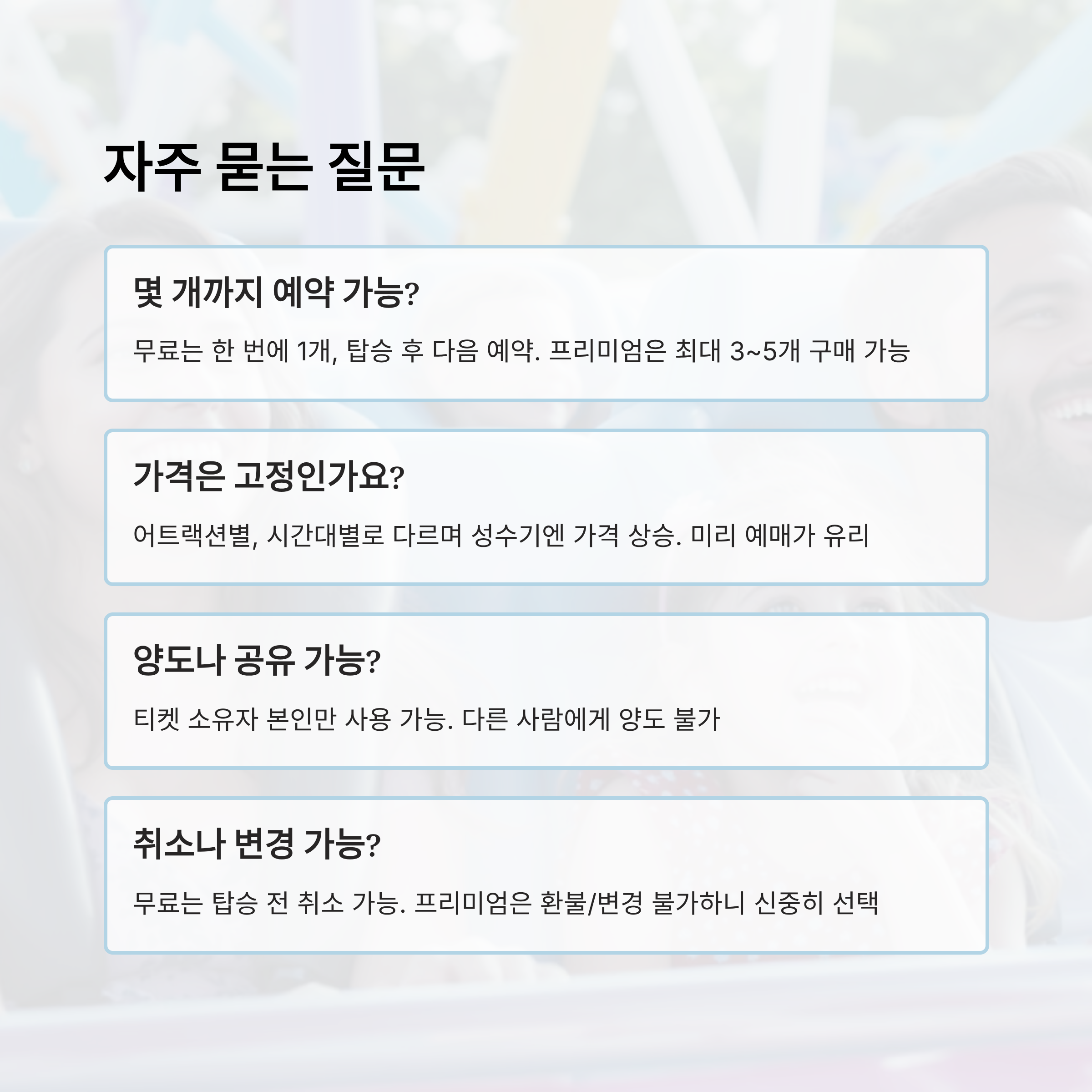 A7. 무료 매직패스는 탑승 전엔 취소 가능하지만, 프리미엄 매직패스는 구매 후 환불이나 변경이 불가능해요. 시간 선택 시 꼭 신중해야 해요!