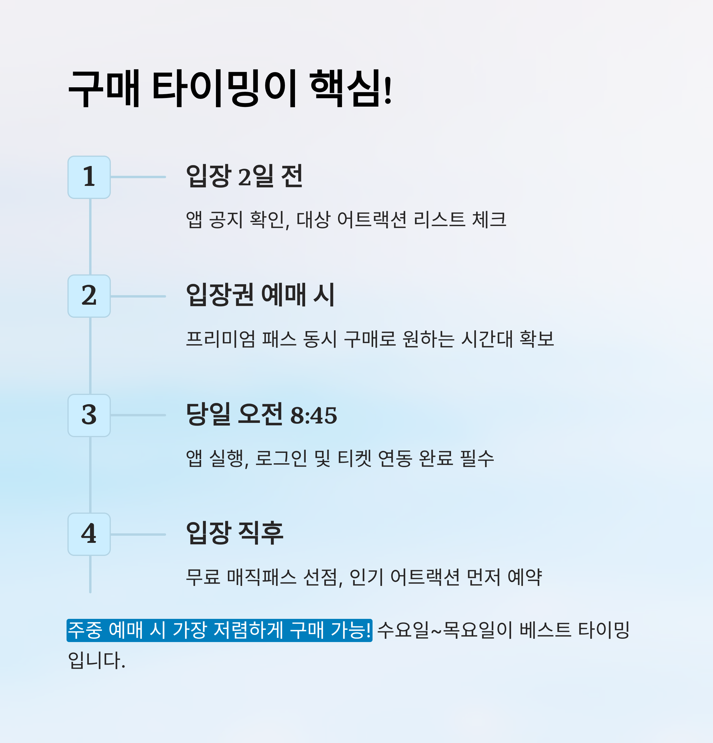 매직패스는 아무 때나 사면 본전 뽑기 어려워요. 가장 핵심은 바로 "언제" 사느냐예요. 특히 2025년 기준으로는 입장권 예매 전부터 매직패스 계획을 짜는 게 무조건 유리해요!