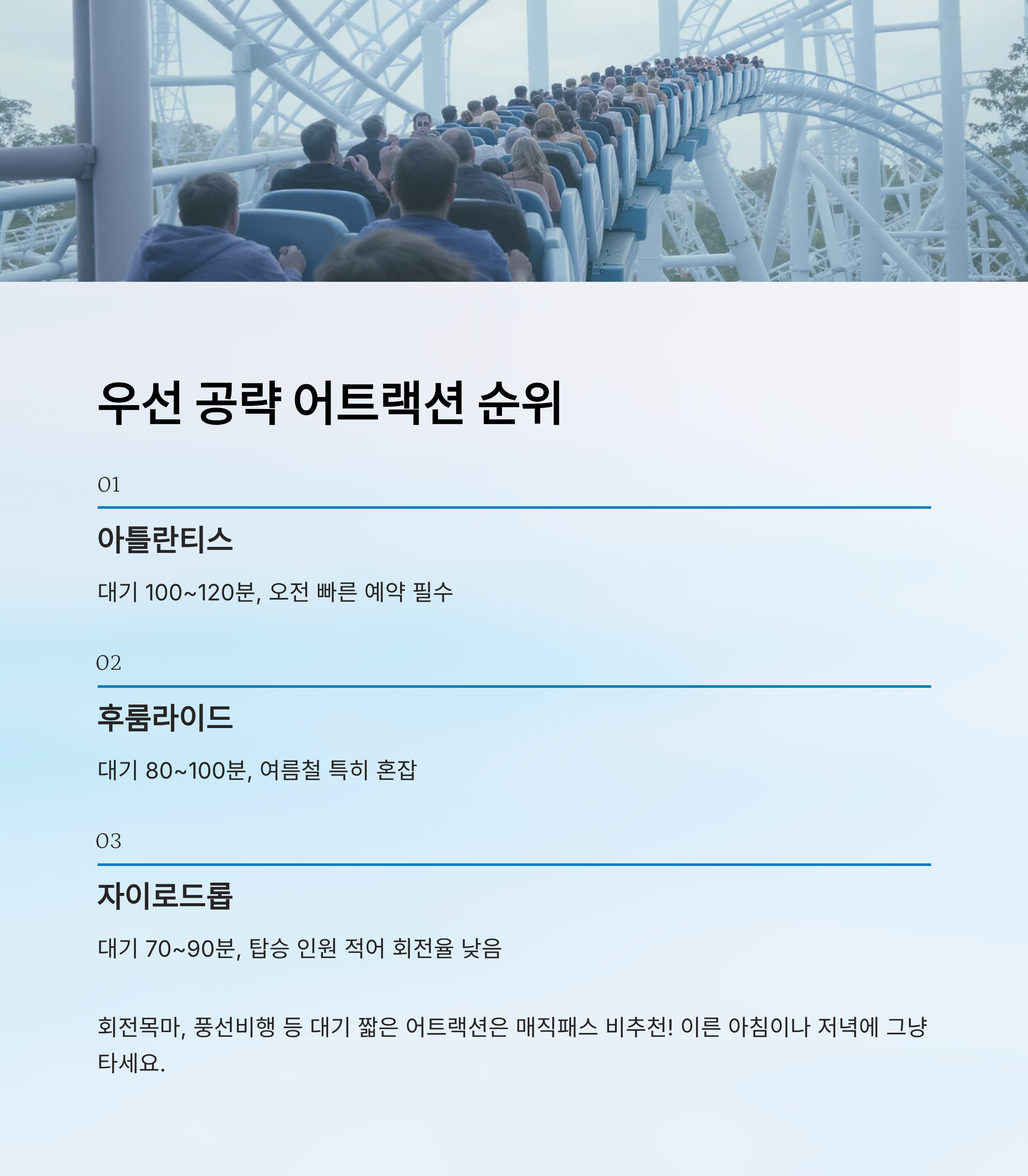 이제, 어떤 놀이기구부터 매직패스를 써야 하는지도 궁금하죠? 다음 섹션에서는 인기 어트랙션 우선순위를 소개할게요! 🎡