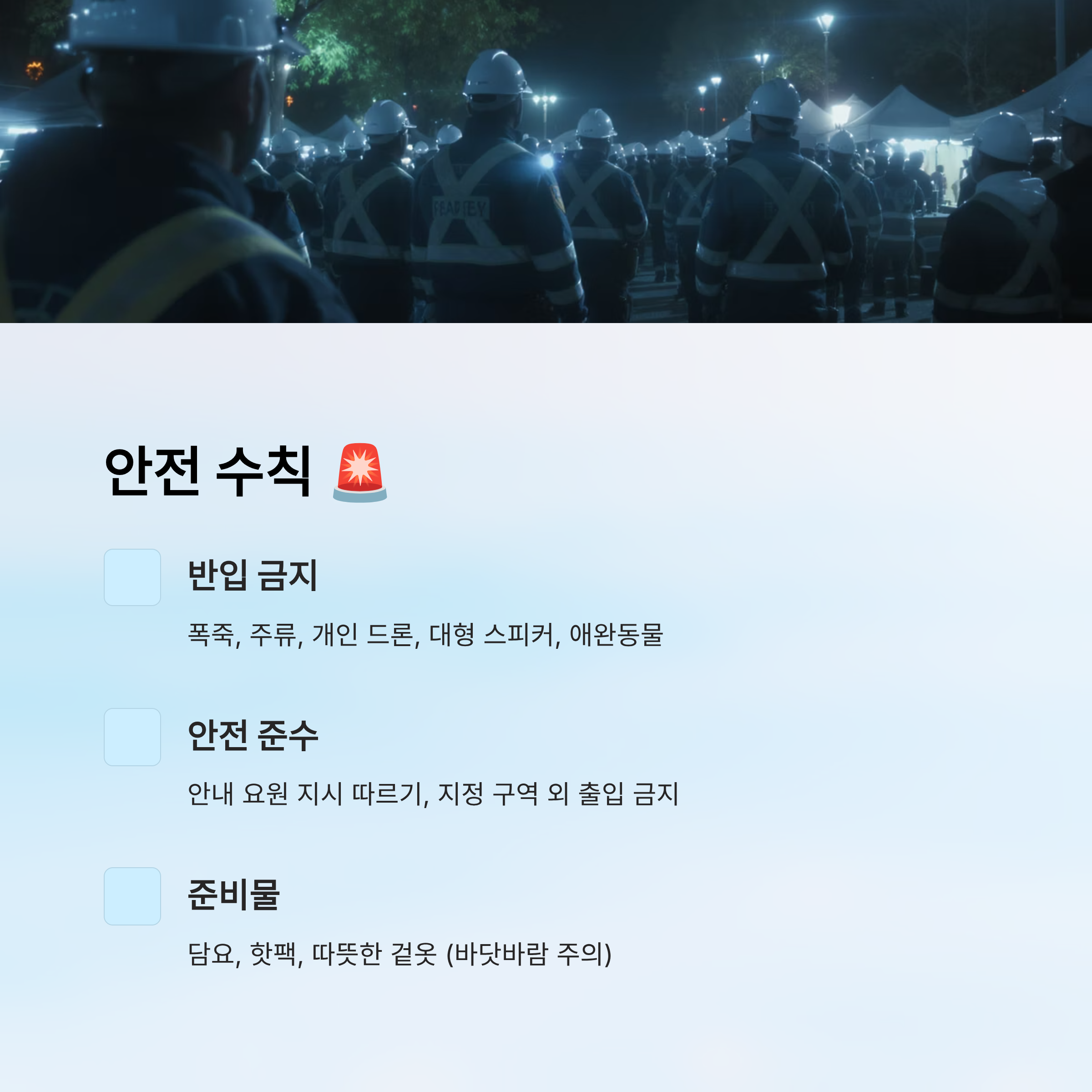 | 안전수칙 | 인화물질 반입 금지, 안내요원 지시 준수 | 위반 시 퇴장 조치 |