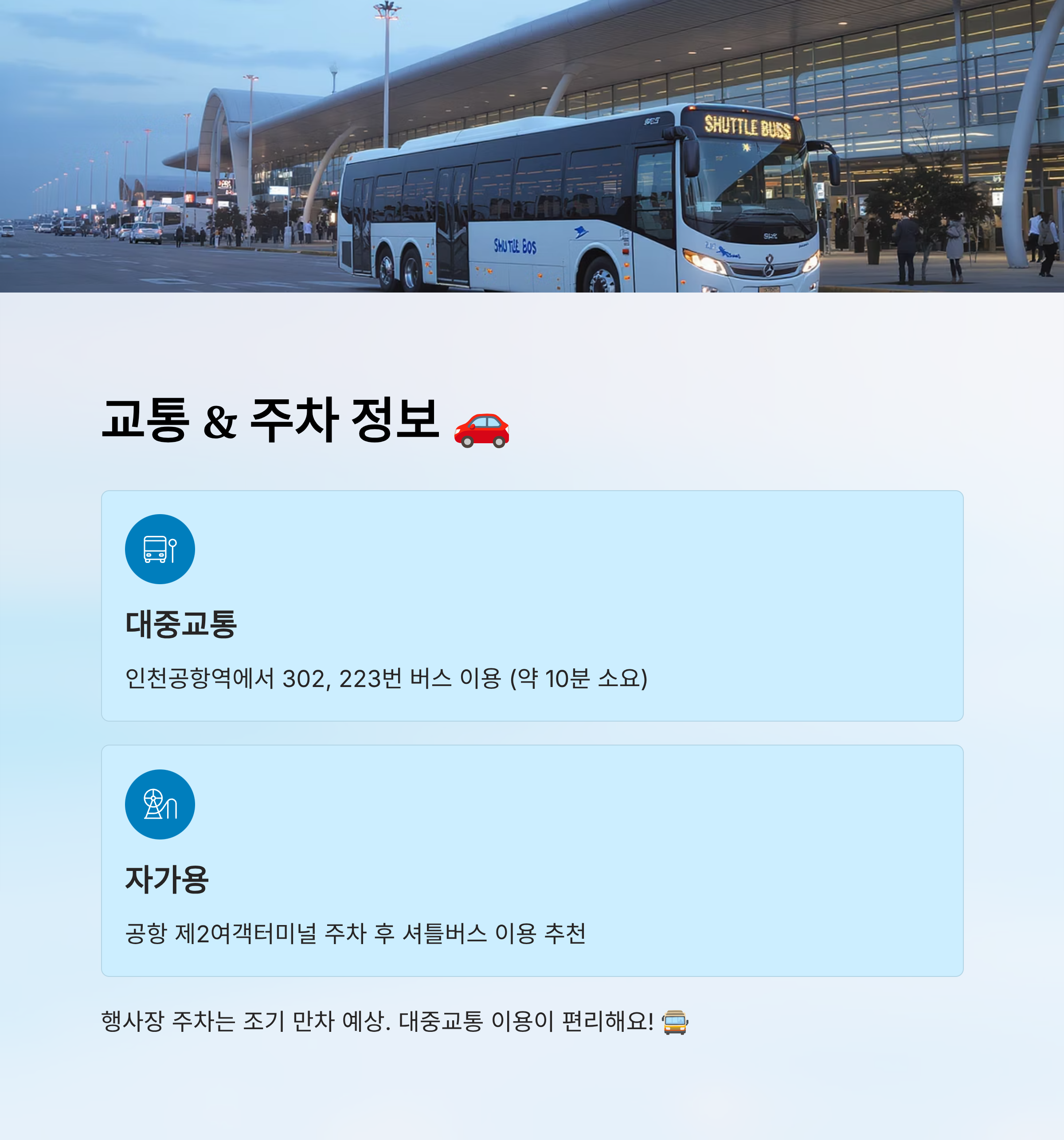 | 자가용 | 주차 제한, 공항 주차장 이용 권장 | 셔틀버스 운행 |