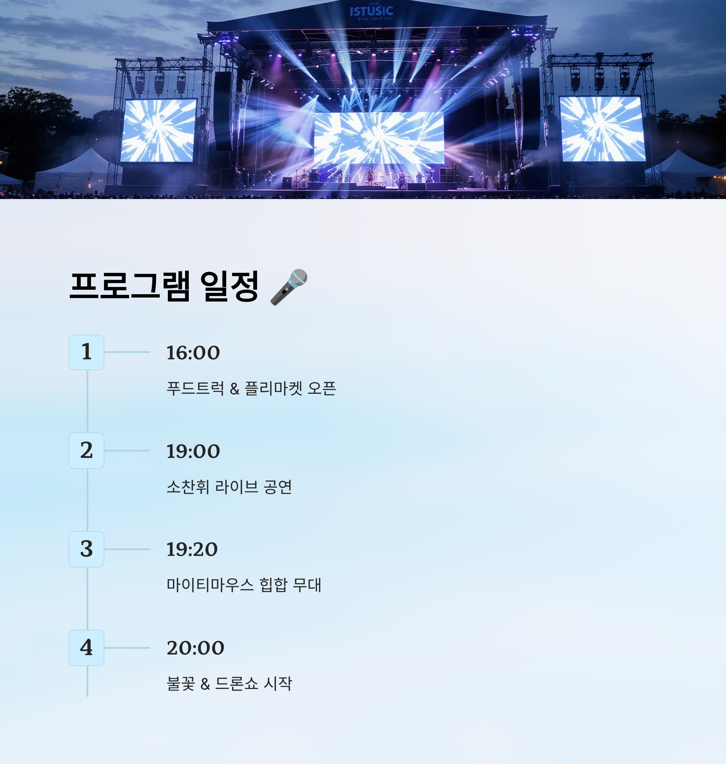 | 16:00~20:00 | 푸드트럭 & 플리마켓 | 다양한 먹거리, 체험부스 | 하늘구름광장 |