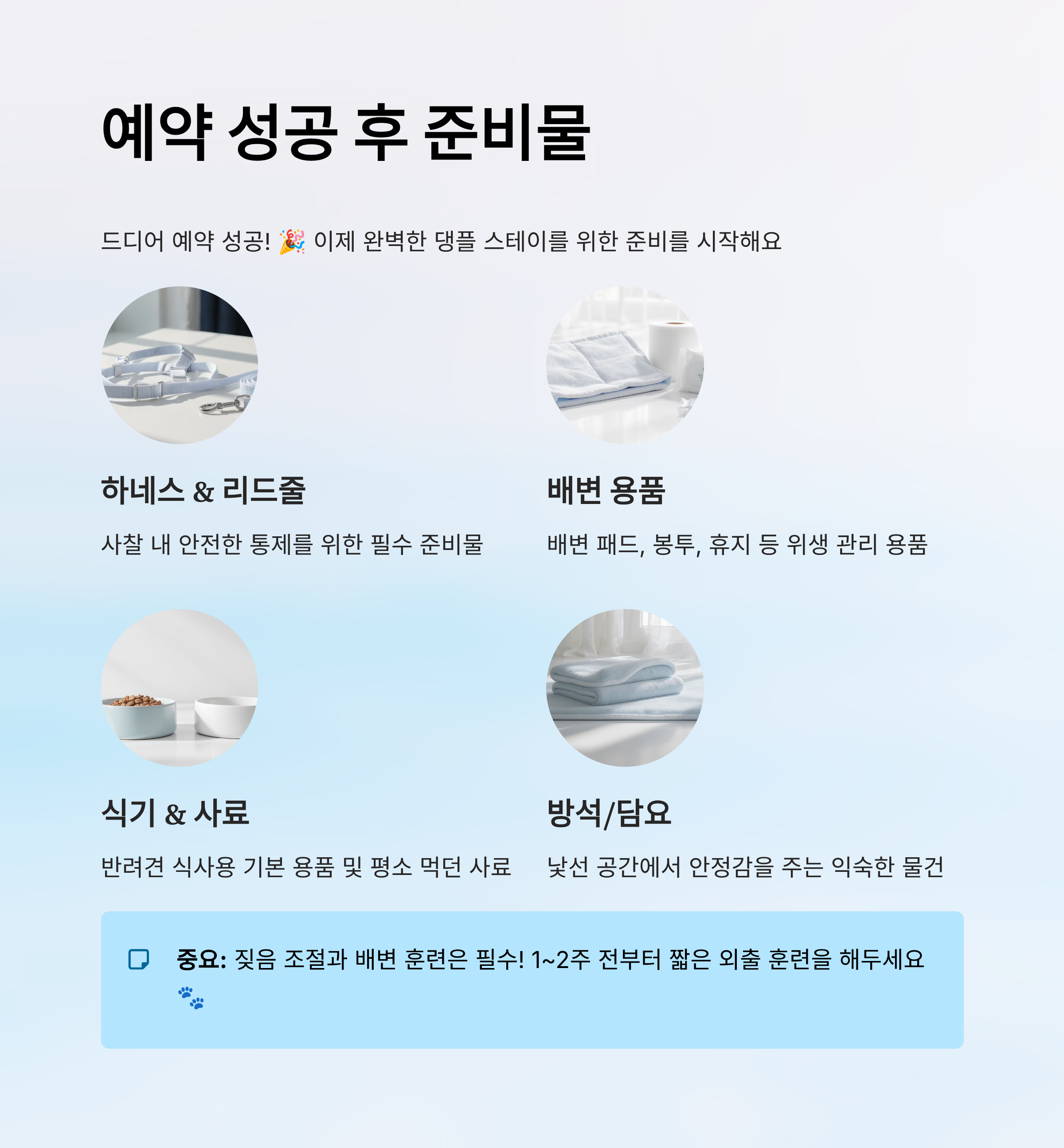 | 짖음/예절 훈련 | 사전 훈련으로 스트레스 줄이기 |