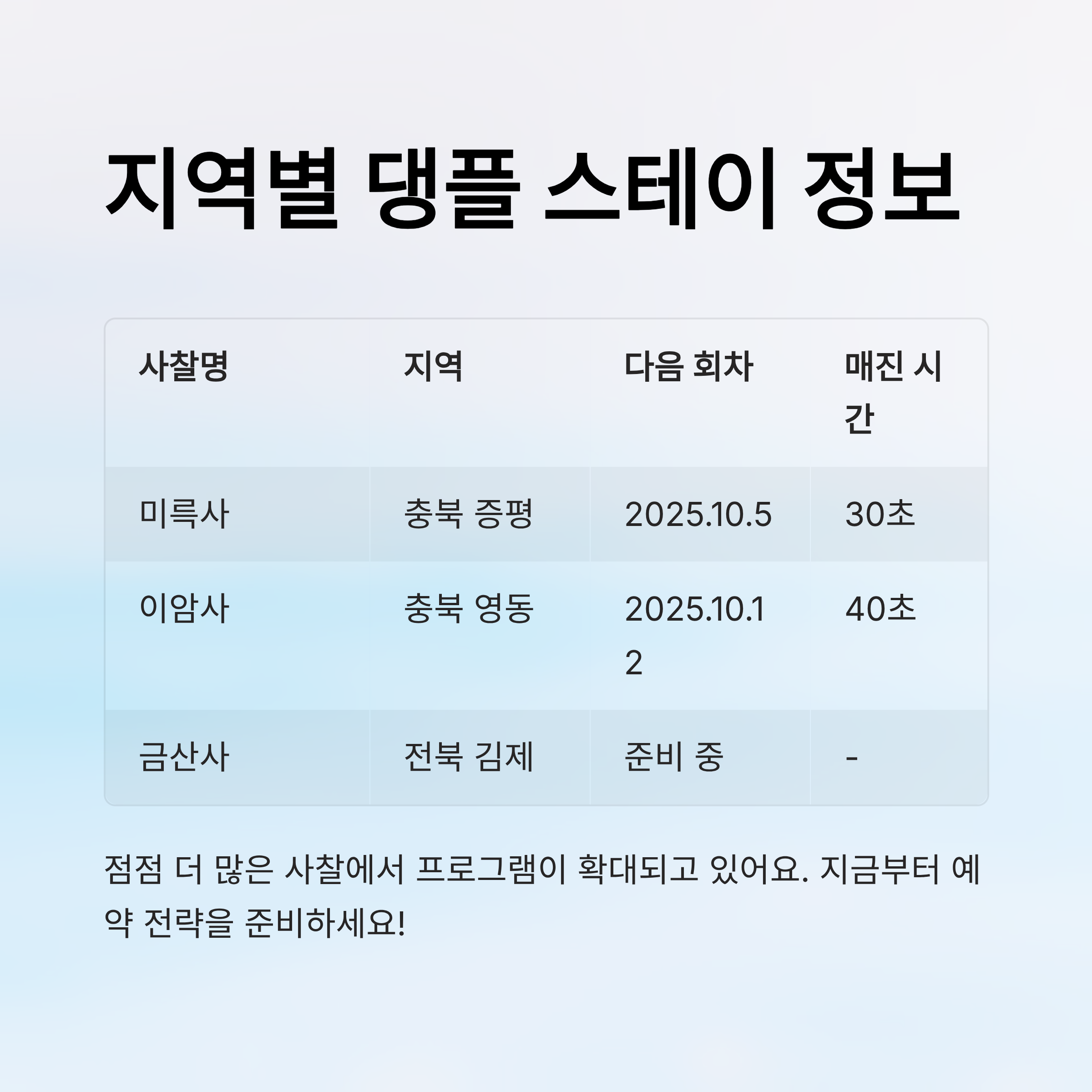 | 지역 | 사찰명 | 진행 여부 | 다음 회차 | 평균 매진 시간 |