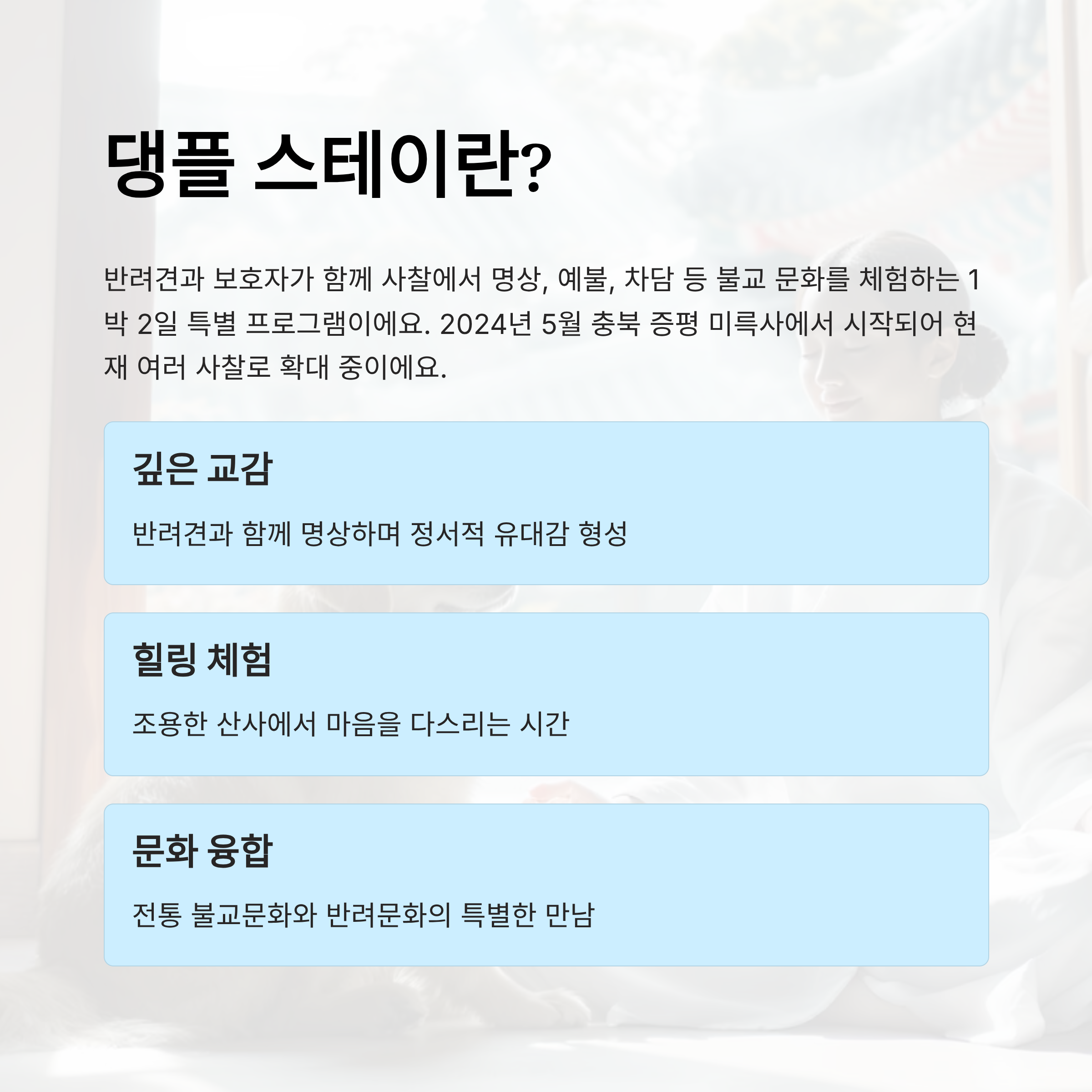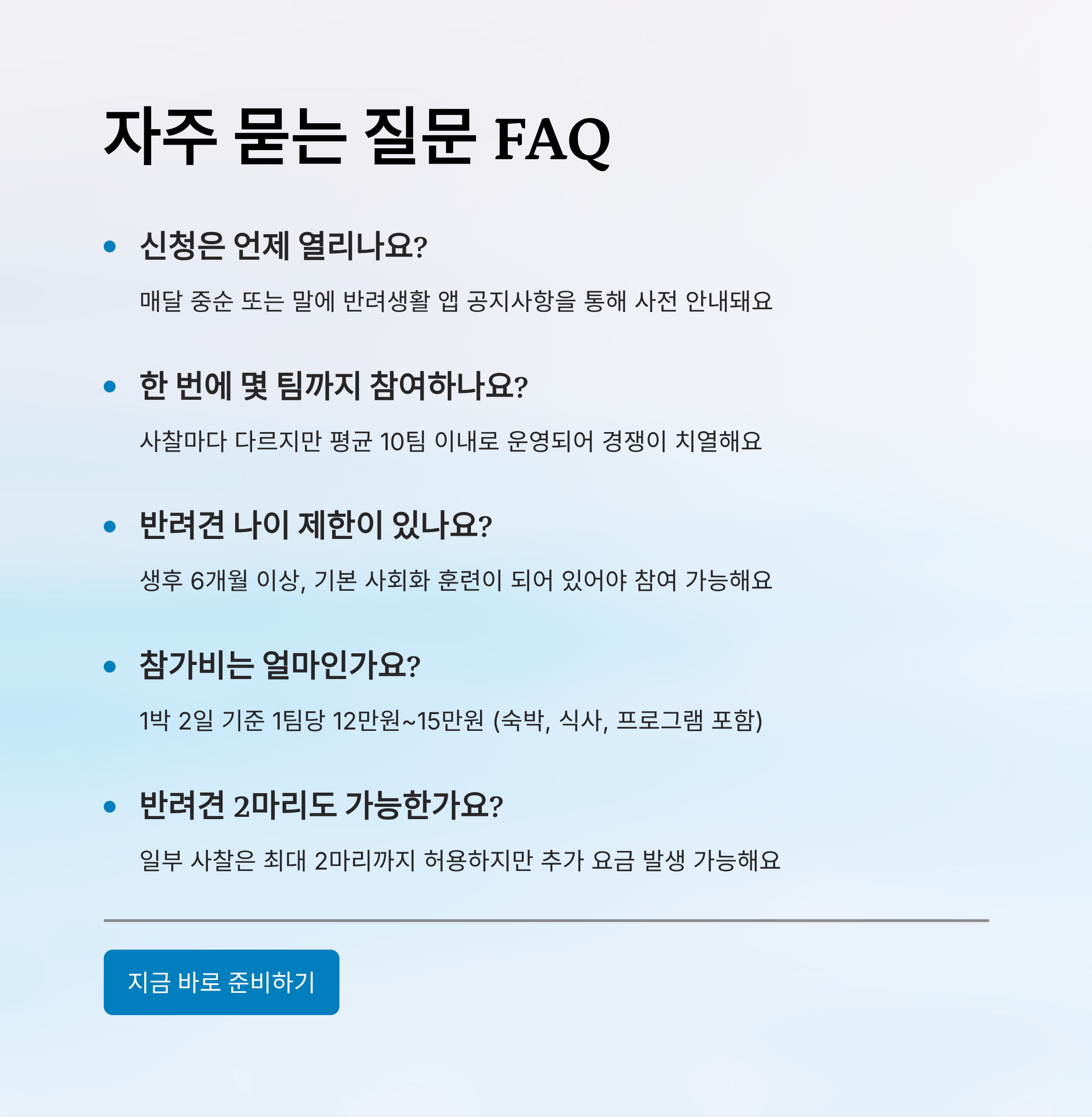 📌 안내: 본 콘텐츠는 2025년 9월 기준으로 작성된 정보이며, 댕플 스테이 운영기관(반려생활 앱, 각 사찰)의 정책 변경에 따라 내용이 달라질 수 있어요. 최신 정보는 반드시 공식 채널에서 확인해 주세요.
