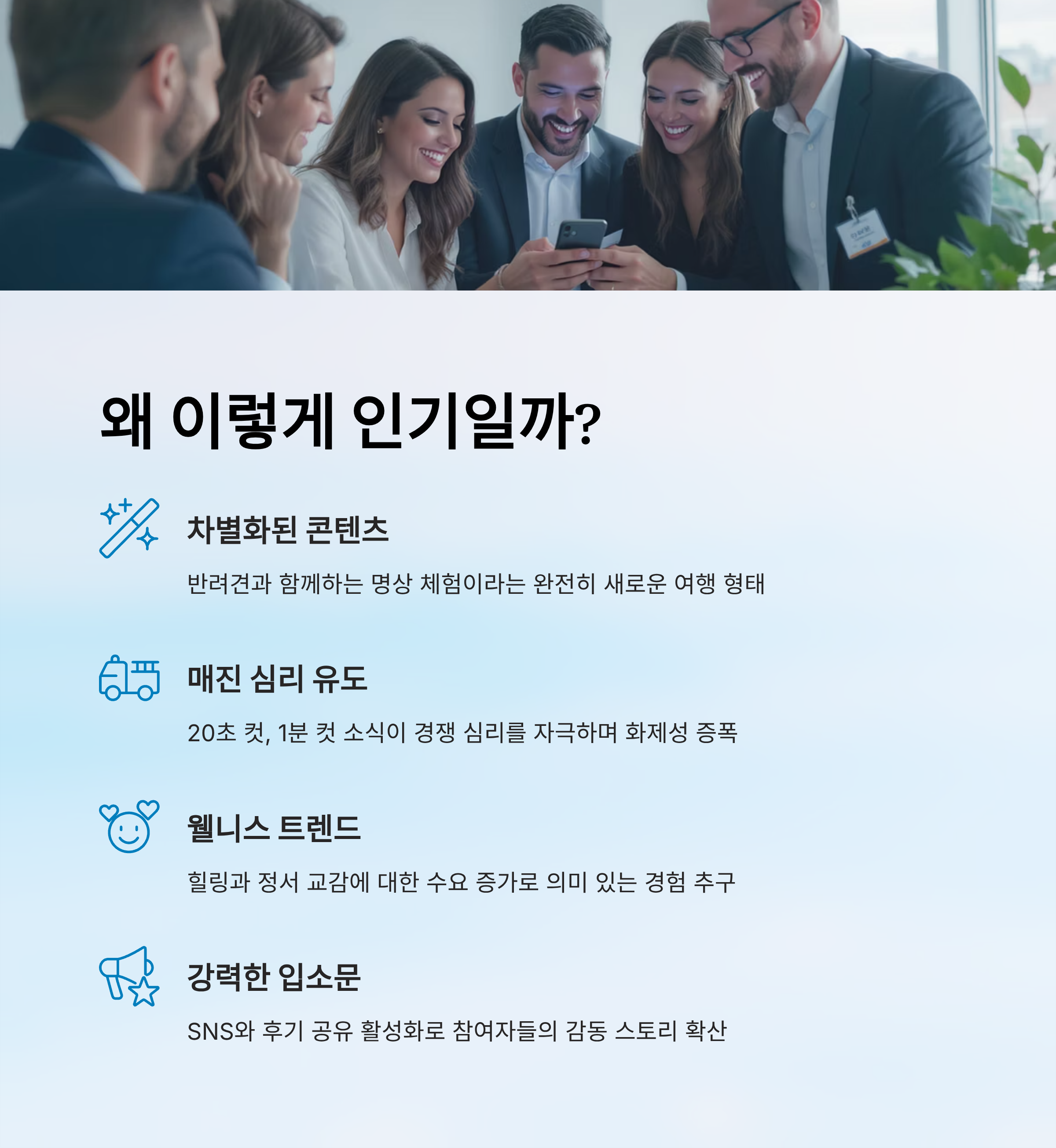 위 표에서 볼 수 있듯이 단순한 여행이 아니라 요즘 사람들이 원하는 감정적 가치, 콘텐츠 차별화, 사회적 이슈까지 모두 갖춘 프로그램이기 때문에 이렇게 인기 있는 거예요. 그만큼 경쟁이 치열한 것도 당연하죠!