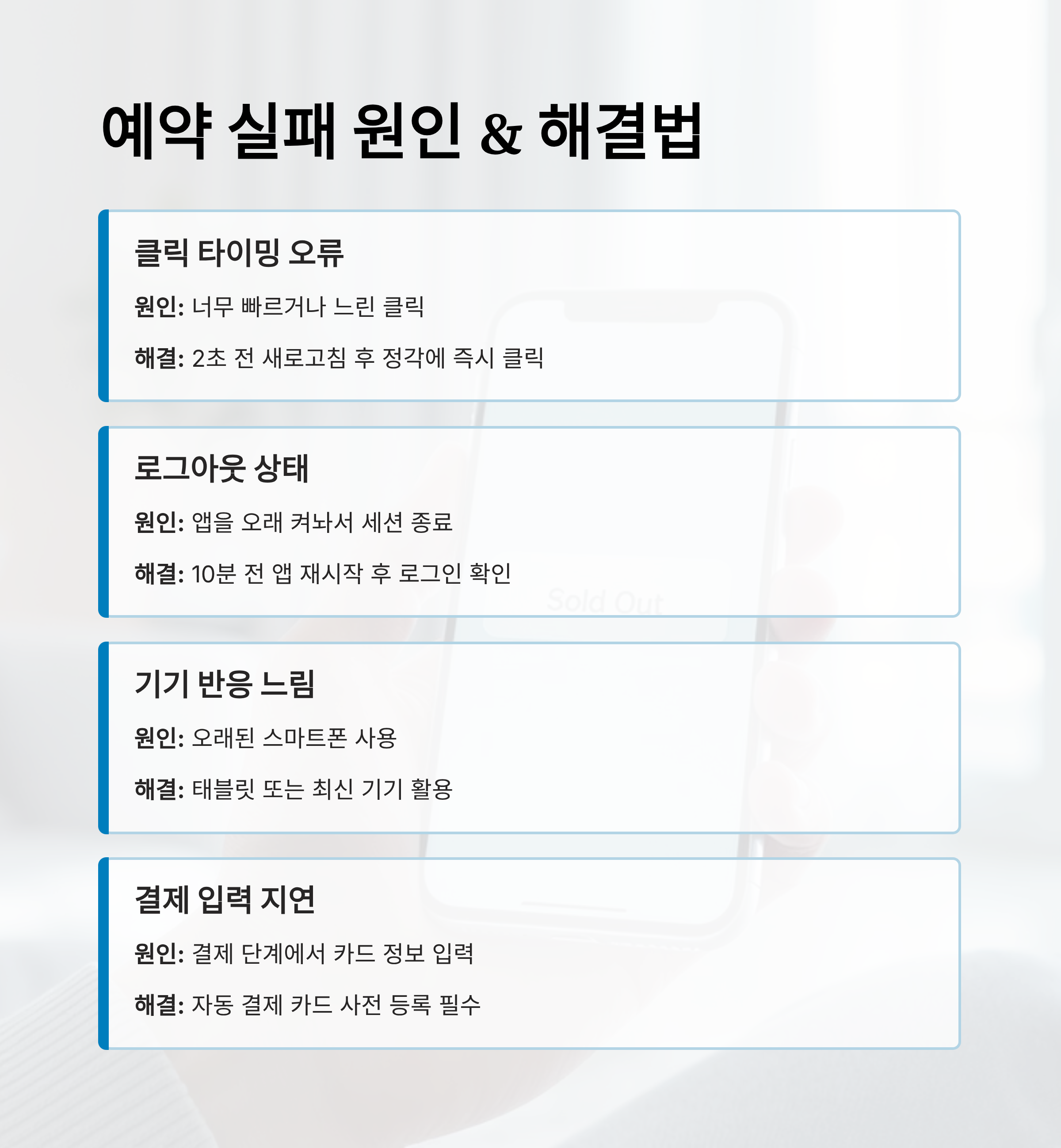 가장 흔한 실패 원인은 '클릭 타이밍 오류'예요. 신청 버튼을 눌렀지만 너무 일찍 클릭하거나, 너무 늦게 눌러서 서버에 요청조차 전달되지 않는 경우가 많아요. 이건 초단위 리듬감이 중요해요. 연습을 통해서 클릭 타이밍 감을 익히는 게 중요해요.