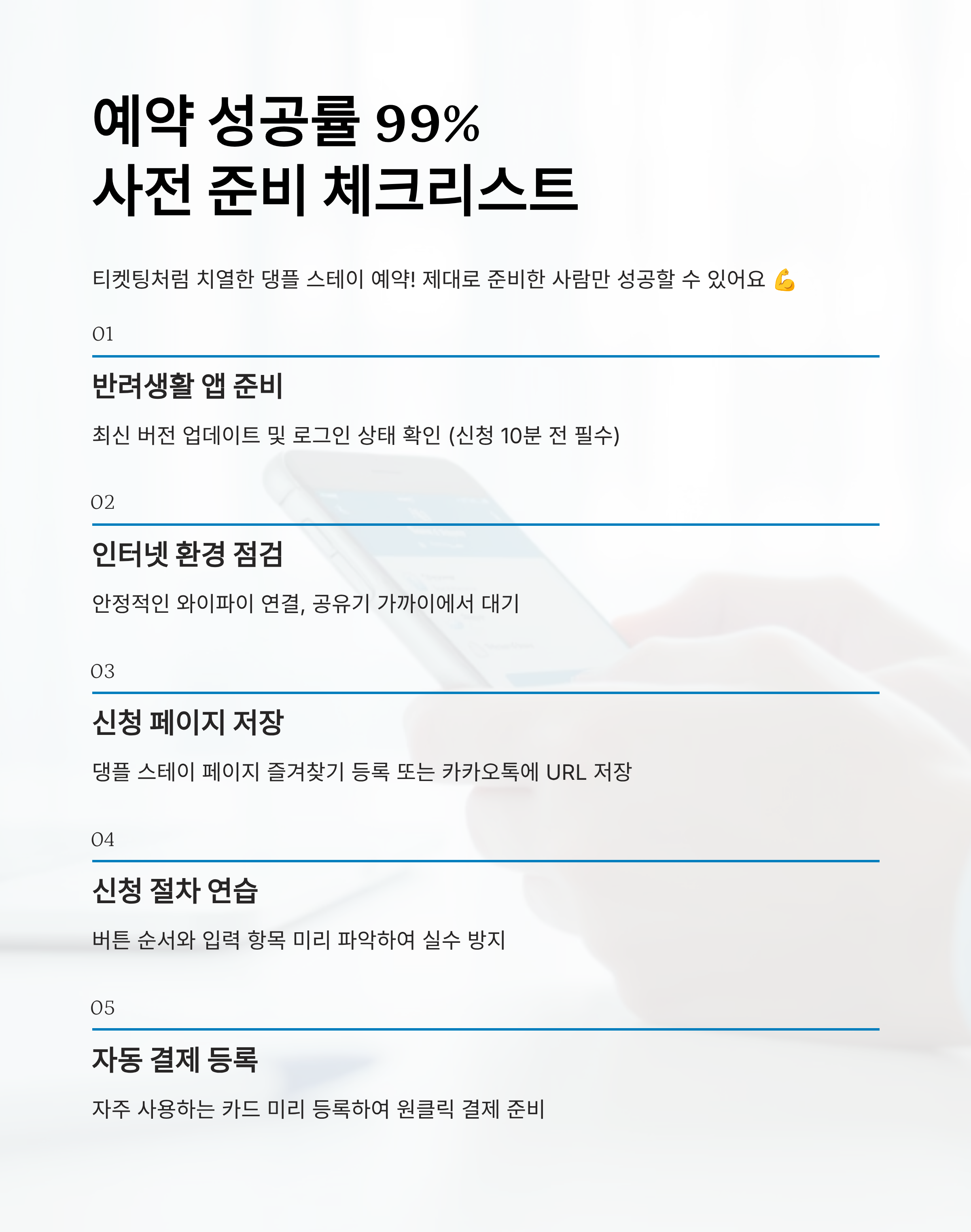 댕플 스테이 예약은 진짜 ‘티켓팅’이에요. 무작정 앱만 켜놓고 있다고 성공하지 않아요. 제대로 준비한 사람만 성공할 수 있어요. 이 섹션에서는 신청 전 꼭 해야 할 사전 준비 리스트를 소개할게요. 이걸 체크하고 도전하면 성공 확률이 확 올라가요 📈